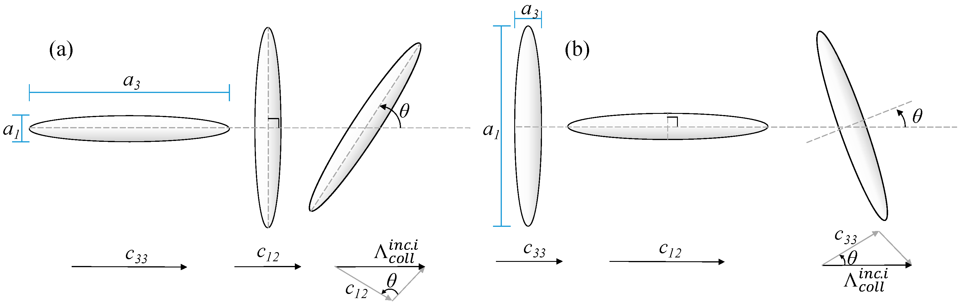 For the calculation of the modified matrix thermal conductivity, the collision cross-sectional area of the inclusion is required. For the general case of a spheroidal inclusion oriented at any angle, Equation (22) was derived for the calculation of the collision cross-sectional area. The detailed derivation for Equation (22) is presented in Appendix A.
