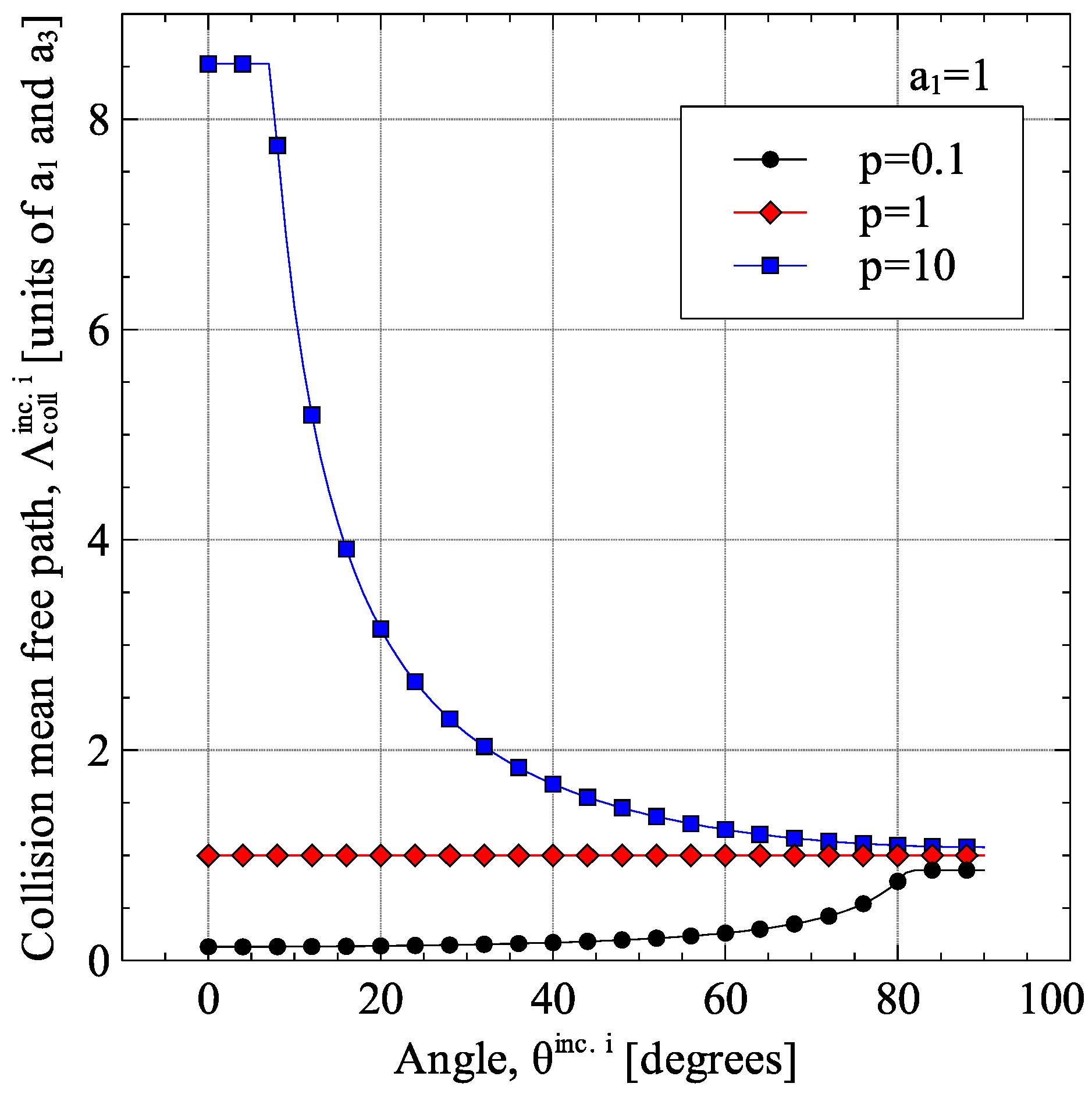 For the inclusions, the collision mean-free-path depends only on the size and orientation of the inclusion itself. For the special cases of inclusion aligned parallel () or perpendicular () to the direction of heat conduction, the collision mean-free-path for inclusion particles can be calculated using Equations (25) or (26), respectively [19]. For the general case of particles oriented at any angle between 0° and 90°, Equation (24) were derived to calculate the collision mean-free-path of inclusion particles. Figure 3 shows the reasoning behind Equation (24). For randomly oriented inclusions, the average orientation of the inclusions was estimated from as . The variation of with angle is shown in Figure 4 for spheroids of aspect ratios 0.1, 1 and 10.