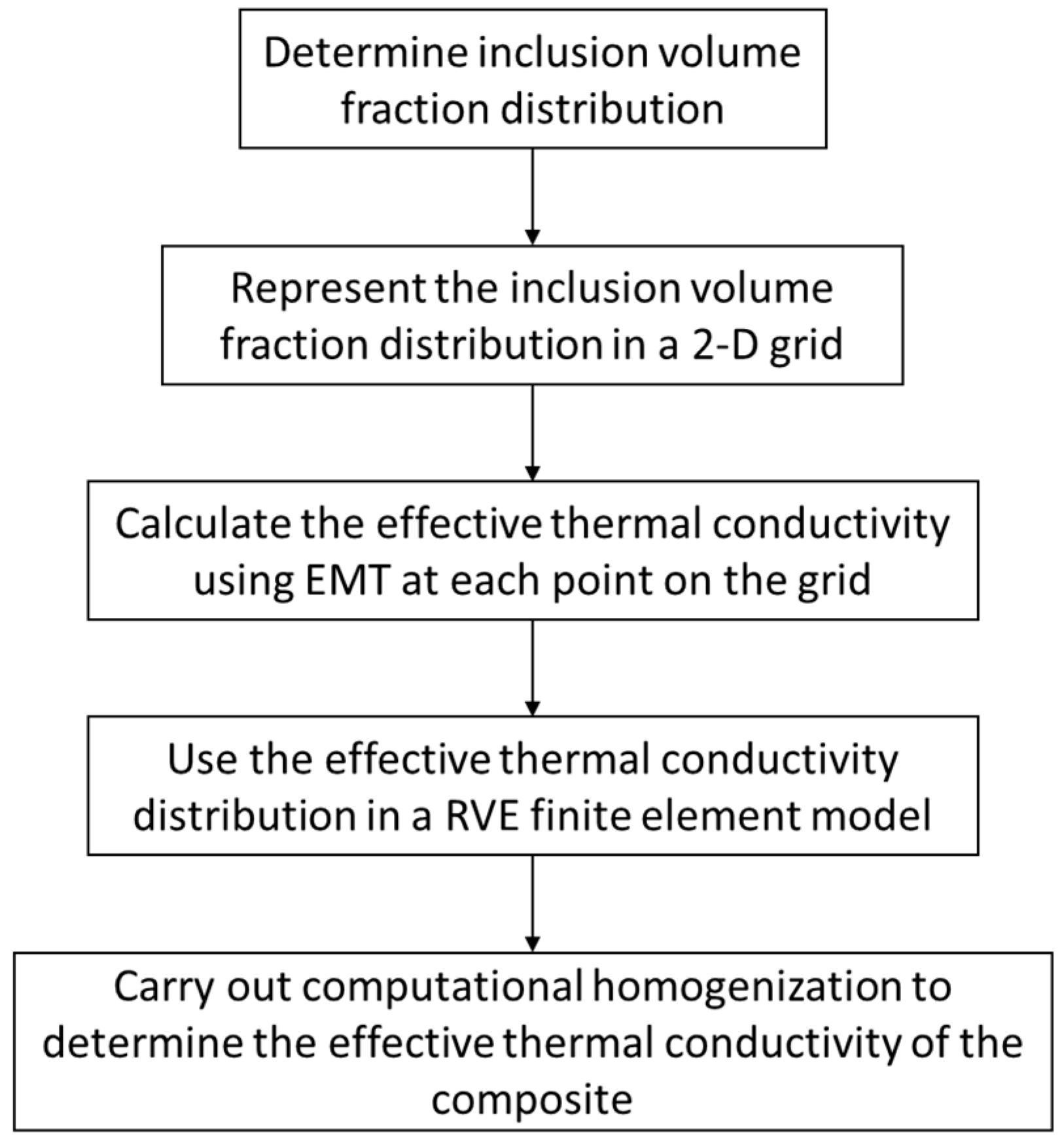 A major drawback of the effective medium theory approach is its inability to handle non-uniform dispersion of inclusions. In the current work, a two-scale approach was proposed that combines the EMT approach at the lower scale with computational homogenization approach at the upper scale [30,31] to introduce the effect of non-uniform dispersion of inclusions in the matrix on the effective thermal conductivity of the composite.