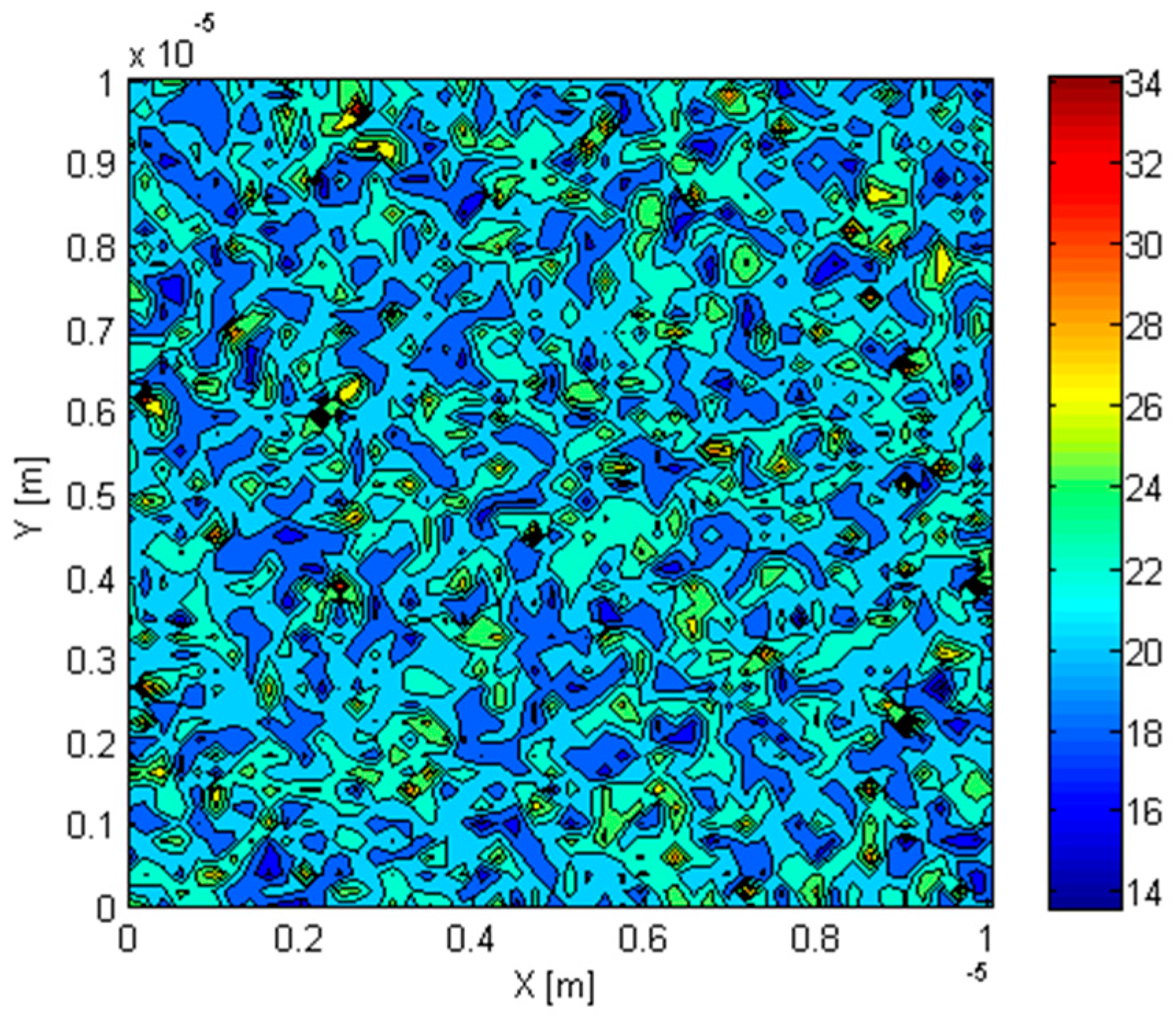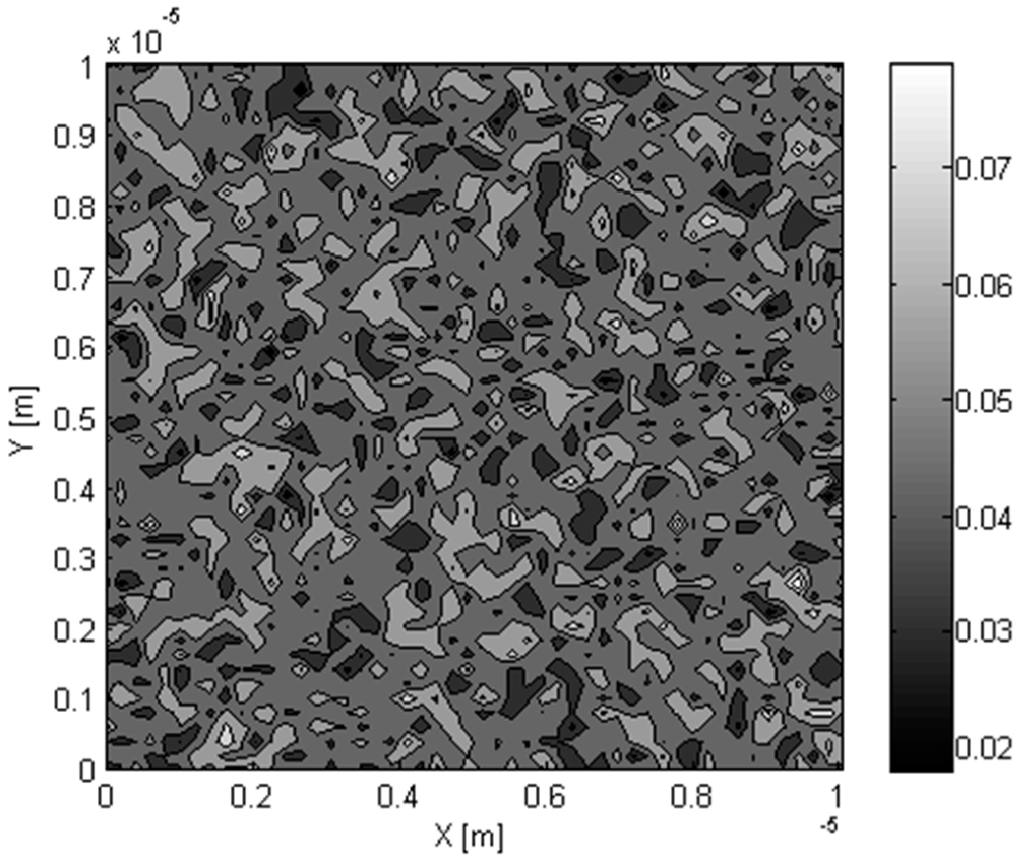 In the first two steps in the methodology, the variation of inclusion volume fraction at different points in the composite is determined and represented in the form of a grid of points for each inclusion. As a result, the distribution of inclusions in the composite can be shown as in Figure 6, which shows the distribution of a nanometer sized Si inclusion in Ge matrix. Because of the scale separation requirement, each point in the grid represents the composite material having a certain volume fraction of inclusions. In the example considered in the figure, the average inclusion volume fraction in the Ge–Si RVE was 5% and the standard deviation of the volume fraction in the microscale domain was 1%. The distribution of the effective thermal conductivity in the RVE determined using the generalized effective medium theory is shown in Figure 7.