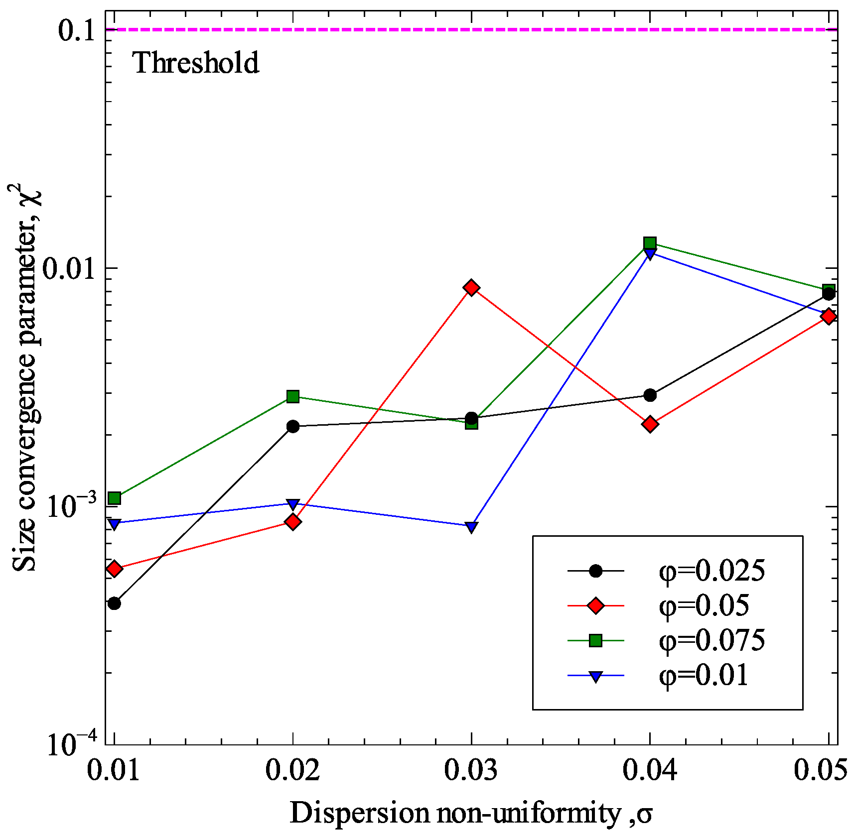 For the computational homogenization problem of the current work, the parameter χ2 was determined for multiple average inclusion volume fractions and multiple dispersion non-uniformity values (modeled using standard deviation of inclusion volume fraction). The results of this study are presented in Figure 8. From the results, it was concluded that the use of RVEs of 10 μm edge length will result in homogenized thermal conductivity values which are independent of the RVE size. Therefore, this RVE size was used.