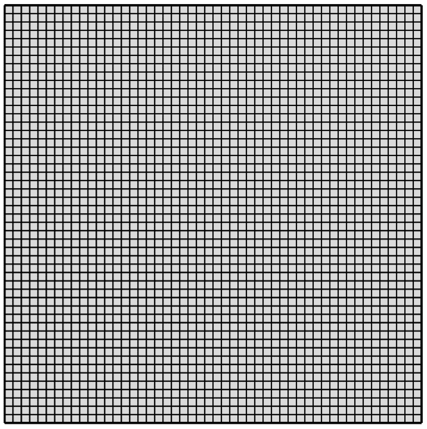 Computational homogenization was carried using COMSOL/MATLAB. A mesh convergence study was conducted to determine the number of elements required for results to be independent of the element size. It was found that increasing the number of elements beyond 50 × 50 did not result in any significant change in the results. The final mesh having 50 × 50 elements used in the current work to carry out computational homogenization is shown in Figure 9.