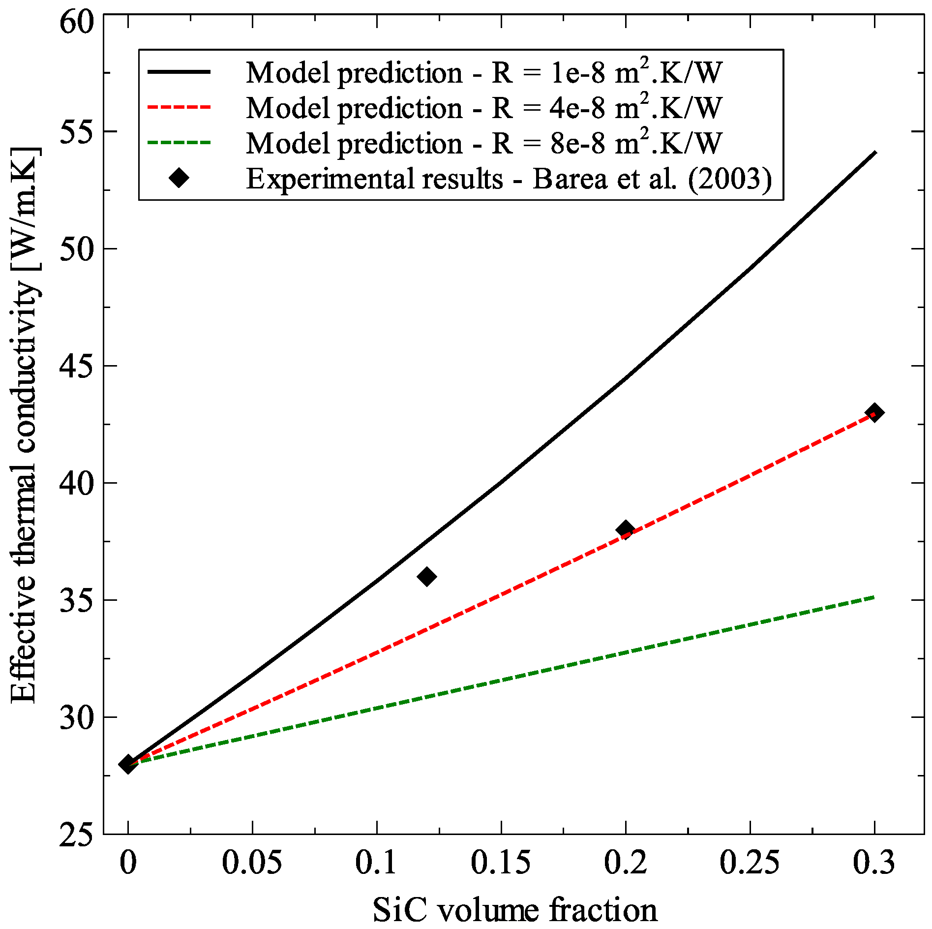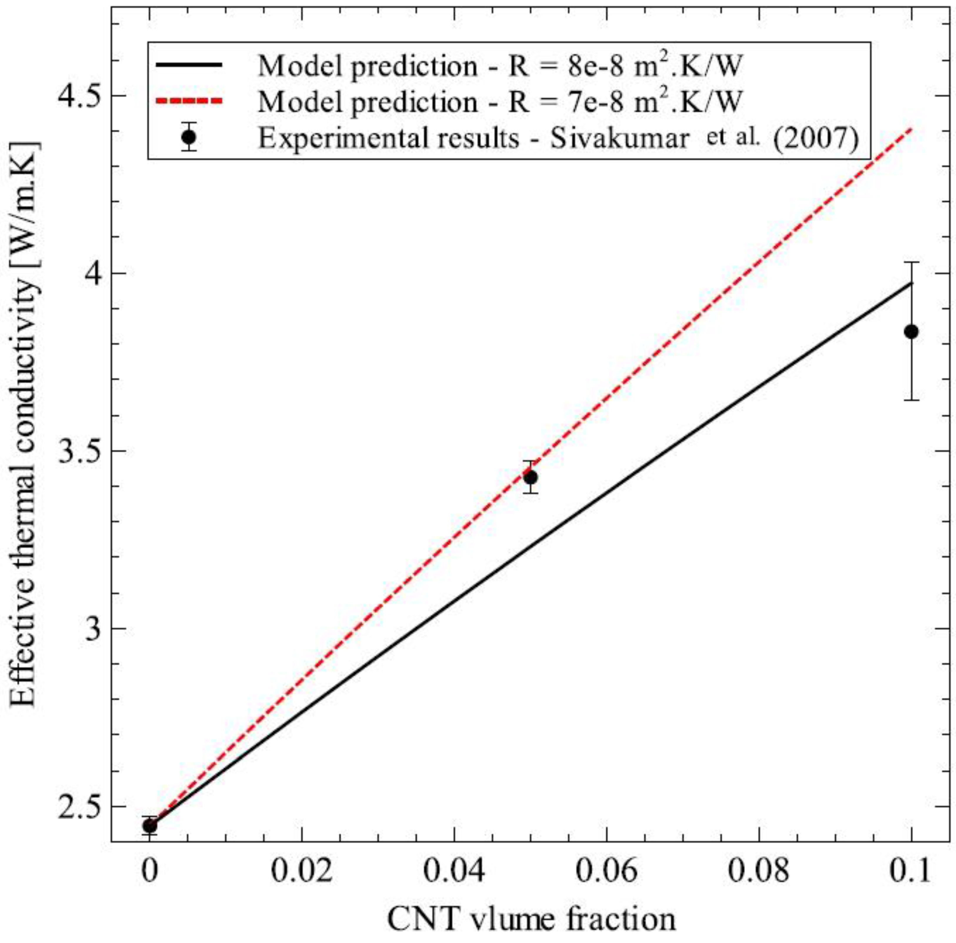 The application of the models mentioned above to nanocomposites can lead to significant errors in the predicted effective thermal conductivity. Many times, the addition of nanoparticles in a matrix can result in an effective thermal conductivity which is significantly lower than the thermal conductivities of both the matrix and the inclusion [13,14]. The use of conventional modeling approaches for such composites results in an overestimation of the effective thermal conductivity even when using very high interface thermal resistance [15,16]. Wu and coworkers [15] used Nan and coworkers’ model [17] to estimate the thermal conductivity of aluminum matrix composites with carbon nanotube (CNT) inclusions and found that the model over-predicted the results even when the thermal interface resistance was set to infinity. Ahmad and coworkers [16] carried out a similar study for alumina–CNT composite and arrived at the same conclusion.