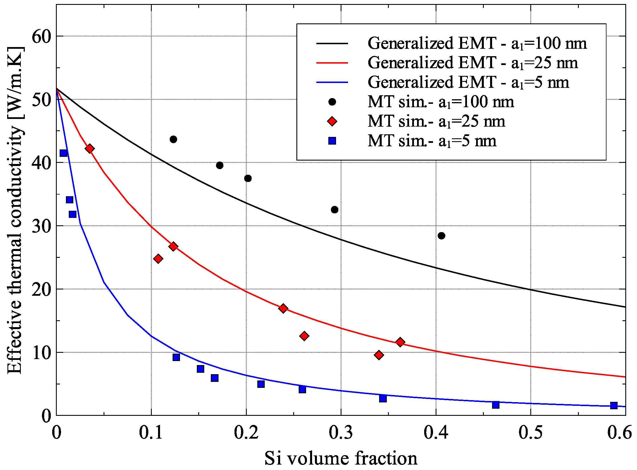 The root-mean-squared error (RMSE) in model predictions for the nanocomposite with Si particles of radii 5 nm, 25 nm and 100 nm were 1.68 W/m·K, 2.18 W/m·K, and 4.45 W/m·K, respectively. These translated to normalized errors of 12.72%, 10.22%, and 12.25%, respectively. The RMSE for the case with inclusion size of 100 nm was higher than the other cases because the thermal conductivity of the composite was higher for this case. On the other hand, the normalized root mean squared error all three cases were almost the same. That being said, the difference in the results of the Monte Carlo simulation and the generalized EMT can be attributed to a number of reasons including the difference in the details included in the models and model domain size. Monte Carlo simulations involve the detailed simulation of the transport of a large number of energy carriers through the material whereas the generalized EMT only models the average effect of transport of energy carriers. But because of their complexity, Monte Carlo simulations are extremely computationally intensive and therefore are usually solved over a unit cell containing a single inclusion particle.