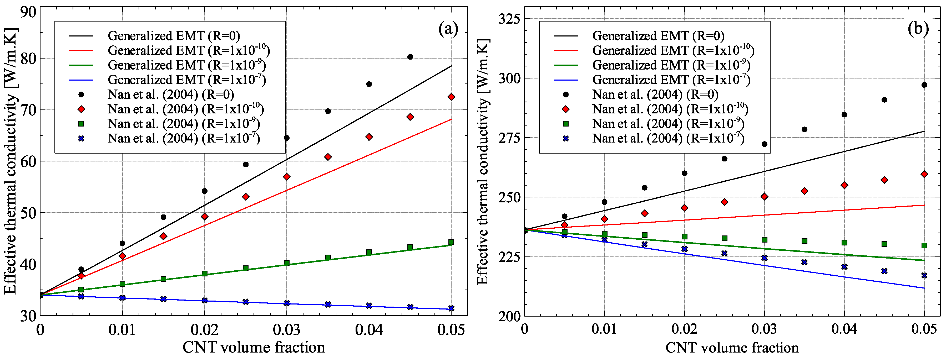The generalized EMT was also applied to the case to alumina and aluminum matrix composites with randomly oriented multi-walled carbon nanotubes (MWCNT). A comparison between the generalized EMT and Nan and coworkers’ model [36] for the two cases is shown in Figure 13. Nan and coworkers’ model can take into account the effect of size and orientation of CNTs on the effective thermal conductivity of the composite but ignores the effect of CNT size on the thermal conductivity of matrix and CNT inclusion itself. The properties of alumina, aluminum, and MWCNTs used in the current work are shown in Table 2.