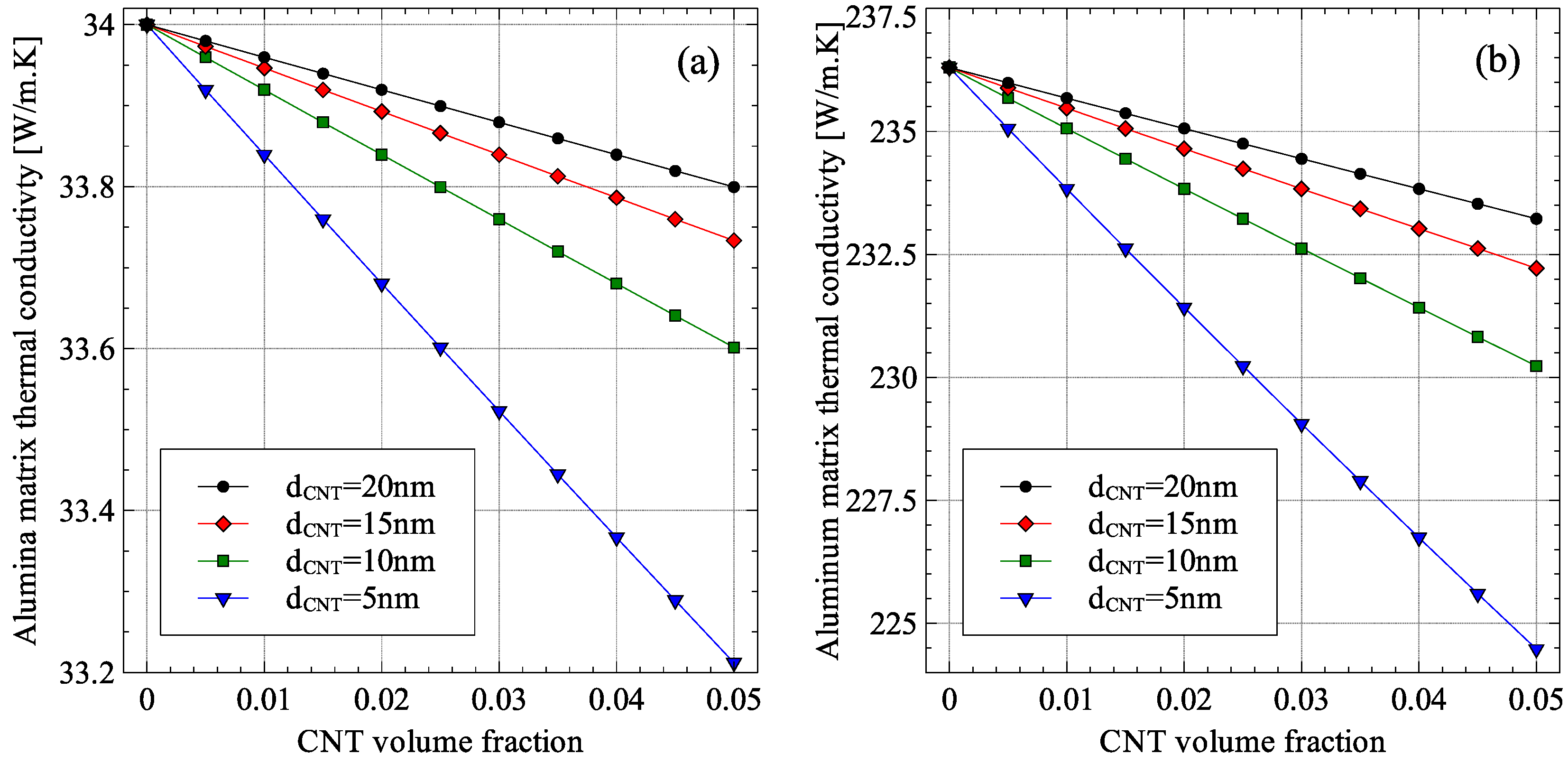 Modified (a) alumina matrix and (b) aluminum matrix thermal conductivities in MWCNT nanocomposites with randomly oriented CNTs.