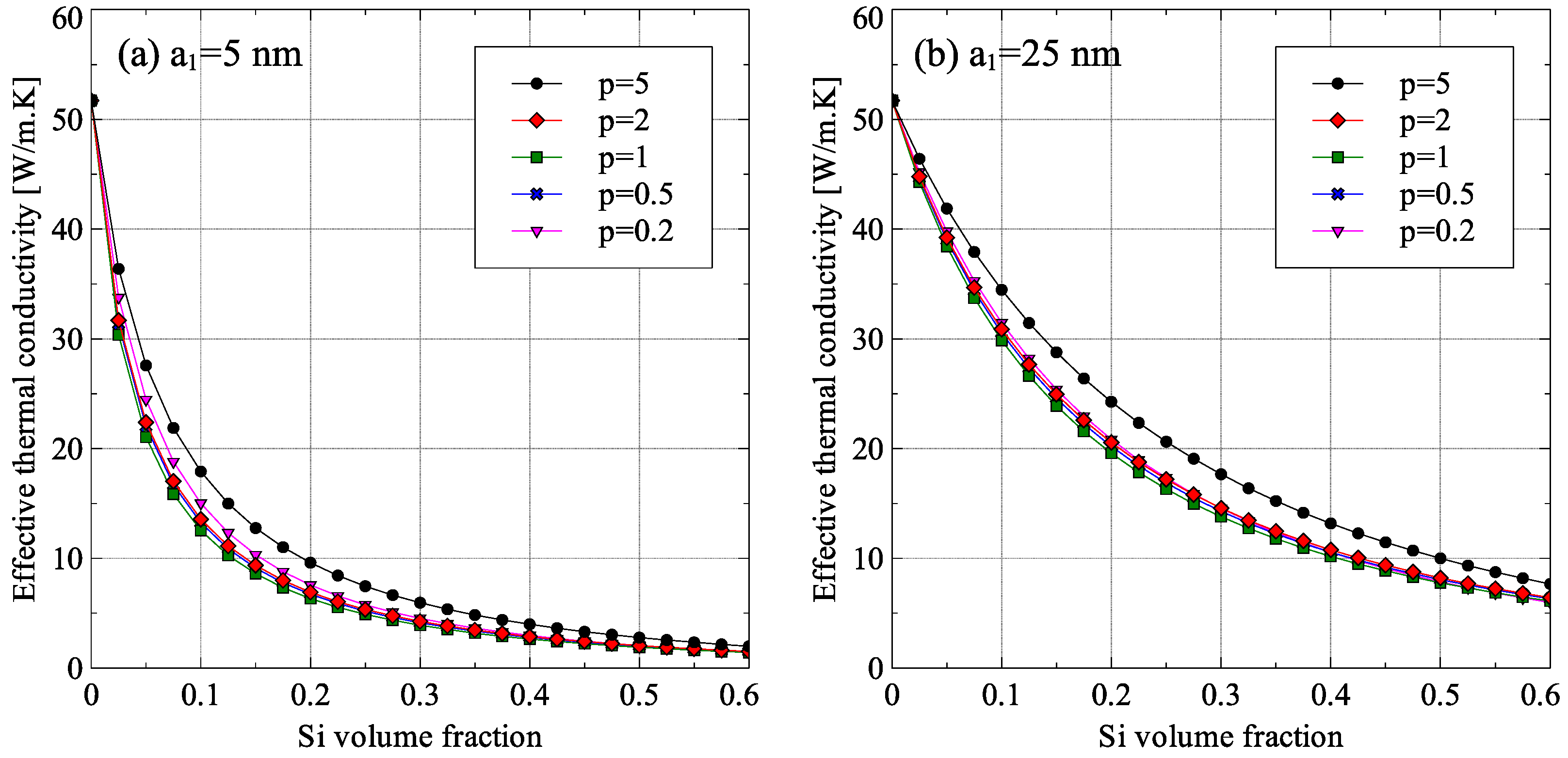 Dependence of Ge–Si effective thermal conductivity on inclusion aspect ratio p for inclusion size equal to: (a) 5 nm; and (b) 25 nm (RTB = 6.80 × 10−9 m2·K/W).