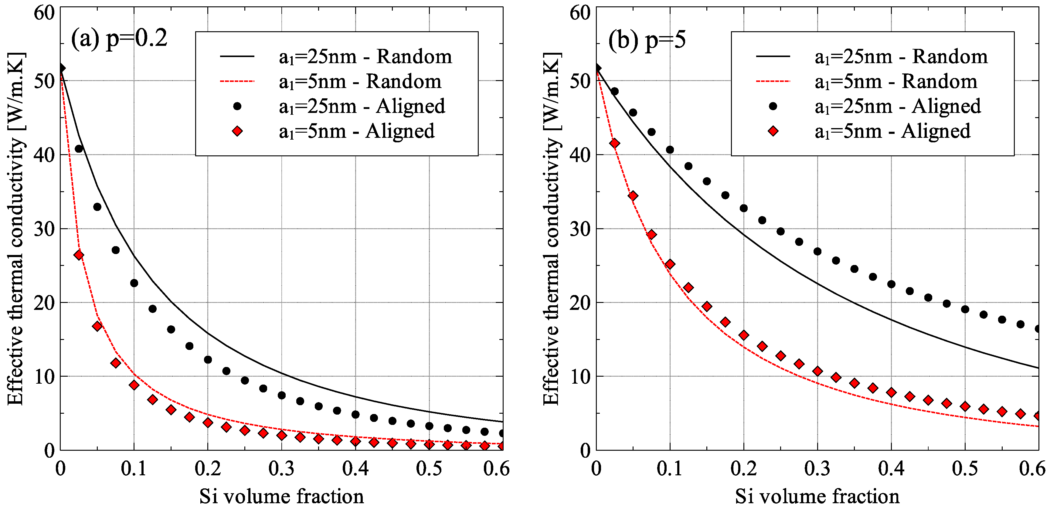 The effective thermal conductivity of aligned spheroidal nanometer-sized inclusions was estimated by Ordonez-Miranda and coworkers [19]. The generalized EMT presented in the current work extends their approach to composites with randomly oriented spheroidal inclusions. A comparison of the axial direction effective thermal conductivity of Ge–Si nanocomposites with aligned and randomly oriented inclusion is presented in Figure 16, for two different aspect ratios of inclusions. For oblate inclusions (p < 1), the alignment of inclusions in a specific direction resulted in reduced effective thermal conductivity, which is the main purpose of the development of Ge–Si nanocomposites. On the other hand, for prolate inclusions (p > 1), the effect was reversed and randomly oriented prolate inclusions were more effective in reducing the thermal conductivity of Ge–Si composites.