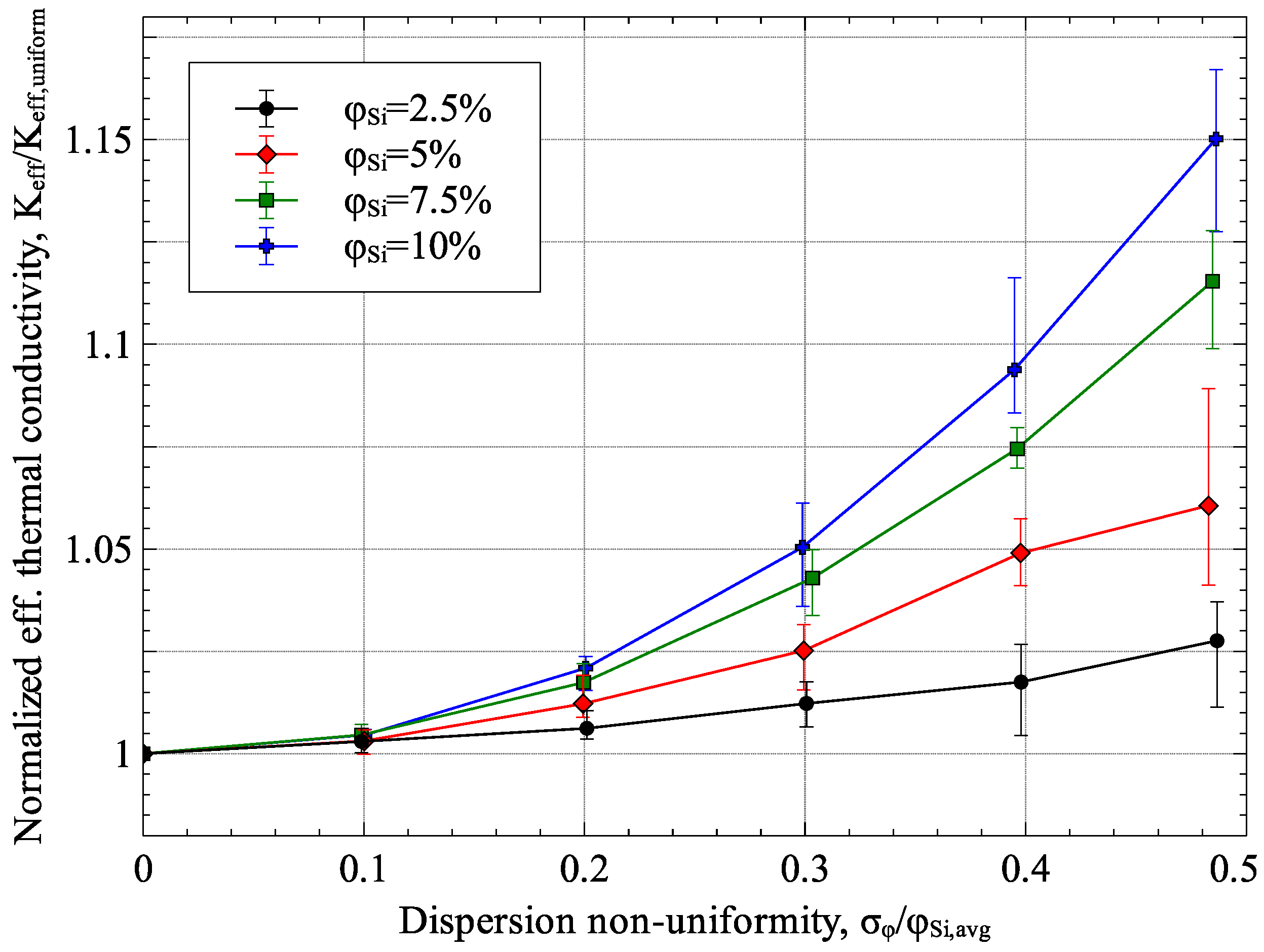The two-scale approach presented in the current was used to study the effect of non-uniform dispersion on the effective thermal conductivity of Ge–Si nanocomposites. Without loss of generality, Ge–Si nanocomposites with 2.5%, 5%, 7.5% and 10% Si inclusions with a diameter equal to 10 nm were considered in the study. The results, presented in Figure 17, show the effective thermal conductivity of the Ge–Si nanocomposite normalized with effective thermal conductivity of Ge–Si nanocomposite with uniformly dispersed inclusions plotted against the non-uniformity in inclusion distribution (shown in the figure as the ratio of standard deviation, σφ, and average inclusion volume fraction, φSi,avg). To analyze the variation of results due to randomness, each case was repeated five times by randomly generating an inclusion distribution in the RVE. As can be seen from the figure, the effectiveness of Si inclusions in reducing the effective thermal conductivity of the composite is adversely affected by non-uniformity in inclusion dispersion.