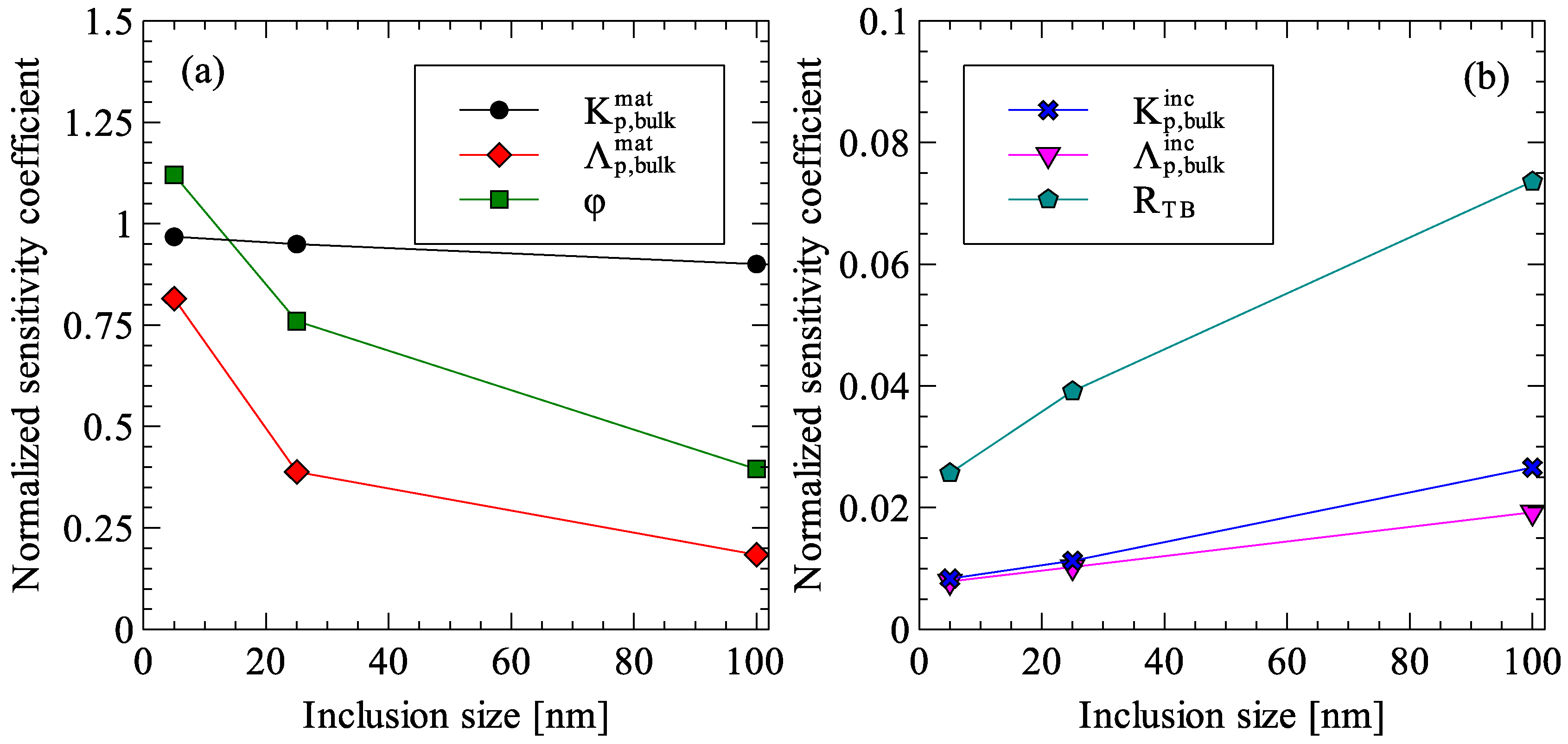 For the case of Ge–Si nanocomposite, the results of the sensitivity analysis are presented in Table 3 for three inclusion sizes and the variation of the normalized sensitivity coefficients with inclusion size is presented in Figure 18. The results of the study showed that the NSCs of three model parameters, bulk matrix thermal conductivity, matrix phonon mean-free-path and inclusion volume fraction, were at least an order of magnitude higher than the NSCs of the remaining three parameters. This implies that the effective thermal conductivity of the Ge–Si nanocomposite is an order of magnitude more sensitive to changes in these three parameters. An analysis of Figure 18 also revealed several important points regarding the sensitivity of the generalized effective medium theory to the model parameters. First, the NSC of the bulk matrix thermal conductivity remained almost constant for inclusion radii from 5 nm to 100 nm. This means the sensitivity of the effective thermal conductivity of the composite is independent of the inclusion size. Second, with an increasing inclusion size, the NSCs of matrix phonon mean-free-path and the inclusion volume fraction decreased while the NSC of the thermal interface resistance showed a significant increase. Both inclusion volume fraction and matrix phonon mean-free-path affect the reduction in the matrix thermal conductivity due to nanometer sized inclusion. This suggests that with an increase in the inclusion size, the effect of interfacial thermal resistance starts to dominate the effect of reduced matrix thermal conductivity.