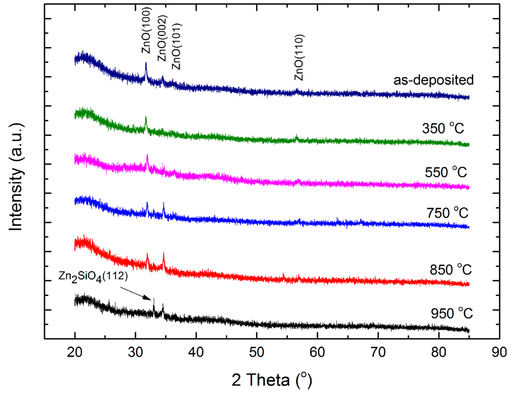All three primary diffraction peaks, namely (100), (002), and (101) were still dominant when increasing the temperature up to 750 °C, which implies that all the films appear to crystallize equiaxially. When the temperature was further increase to 850 °C, the (101) peak disappeared. At 950 °C, the (100) and (002) peaks were no longer observed and the Zn2SiO4 characteristic peak at 33.027° appeared in the diffraction pattern.