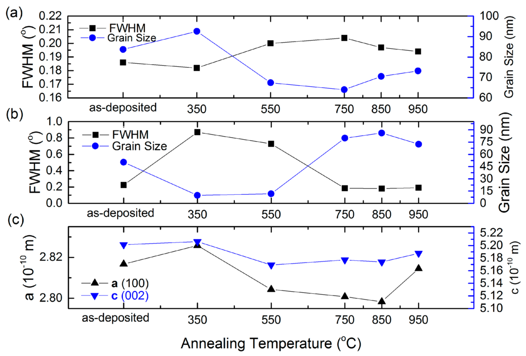 Variation of grain size, full-width at half-maximum (FWHM) and lattice constant with respect to annealing temperature: (a) FWHM and grain size with respect to annealing temperature for peak (100) in the XRD pattern; (b) FWHM and grain size with respect to annealing temperature for peak (002) in the XRD pattern; (c) lattice constant with respect to annealing temperature.