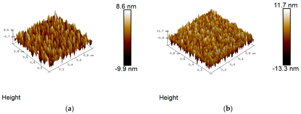 The structural and crystallinity characterizations of the prepared samples were performed by an X-ray diffraction (XRD) system (D8 Advance, Bruker, Billerica, MA, USA) using Cu Kα (40 kV and 40 mA, λ = 1.54056 Å) on the range from 20° to 80° at 2 theta scale. The morphology were further characterized by AFM (Multimode 8, Bruker, Billerica, MA, USA). The optical properties of the annealing films were investigated using a UV–vis spectrometer (Cary 300, Agilent, Santa Clara, CA, USA). Electrical properties such as resistivity, carrier concentration, and mobility were measured by a Hall automatic measuring system (Accent HL6600PC, Midview City, Singapore) using the van der Pauw method. The contacts of the Hall measurement system were indium.