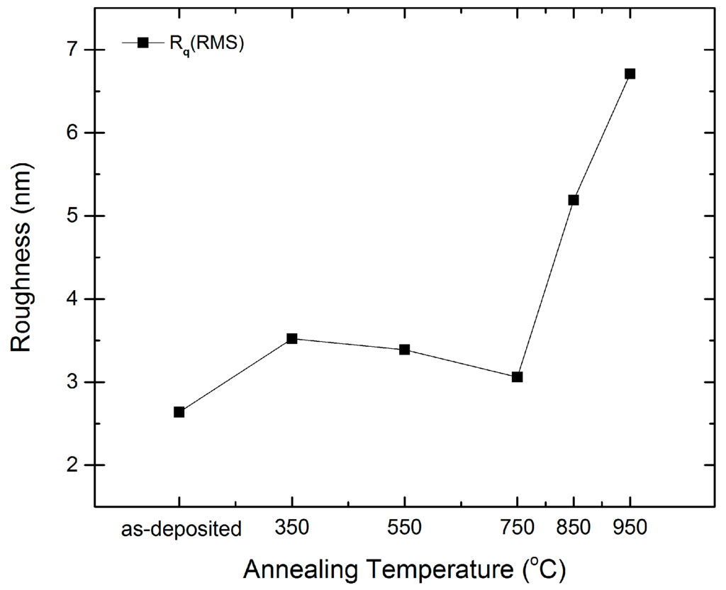 Since transparent conducting oxide (TCO) coated glass is used as substrate in thin film solar cell fabrication, the smoothness of the surface affects the thin films’ deposition at the subsequent stage and thus device performance. Hence, it is important to study the surface morphology as a function of the annealing temperature of the ZnO:Zr films. Figure 3 shows the atomic force microscopy (AFM) images of the as-deposited and annealed ZnO:Zr films on a scanning area of 1 μm × 1 μm. No pin holes were observed in the micrographs, indicating successful deposition of compact films. As seen in Figure 4, the root mean square roughness (RMS) of the as-deposited films is about 2.5 nm, which is in good agreement with that reported by Yan et al. [30]. The grain size of the annealed ZnO:Zr films slightly decreases, as expected, before significantly increasing again at 850 °C. It can be observed in Figure 3 that the grain size parallel to the surface is getting smaller, while the grain size vertical with the substrate is larger. The former reflects the (100) crystalline orientation, and the latter corresponds to the (002) crystalline orientation. Hence, the transformation of the prominent crystalline orientation from (100) to (002) is attributed to RTA process, which is consistent with the hypothesis obtained from the XRD patterns.