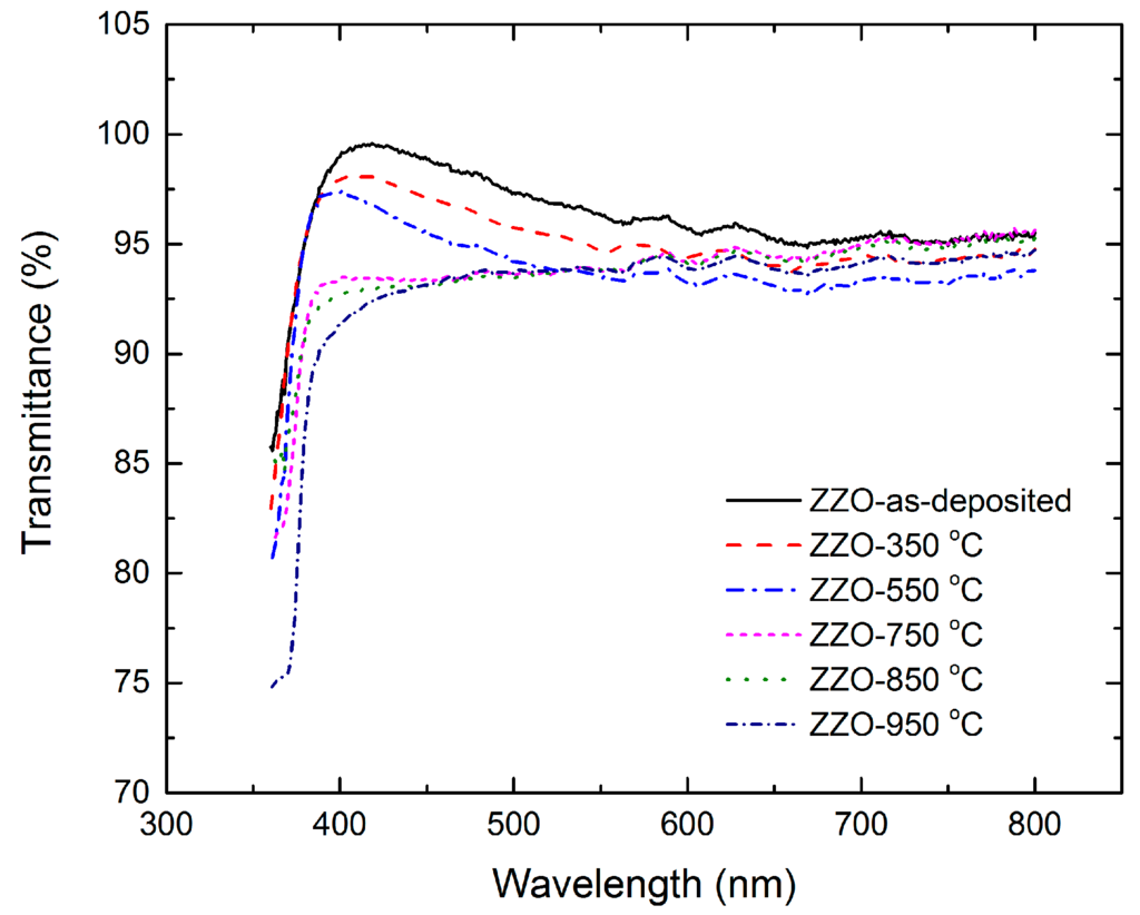 Since the ZnO:Zr film-coated glass is expected to be used as substrate for thin film solar cell fabrication, it is necessary to investigate the optical properties of ZnO:Zr films under various RTA treatments. Figure 5 shows the optical transmittance in the wavelength region 350–800 nm of as-deposited and annealed ZnO:Zr films. It is clear that the films show an average transmittance of over 92% in the visible wavelength. Also, it is important to note that with the increase of the annealing temperature, the edge of the transmission spectrum was red-shifted. The optical band gap () was determined by extrapolation of the plot of α2 versus [31].