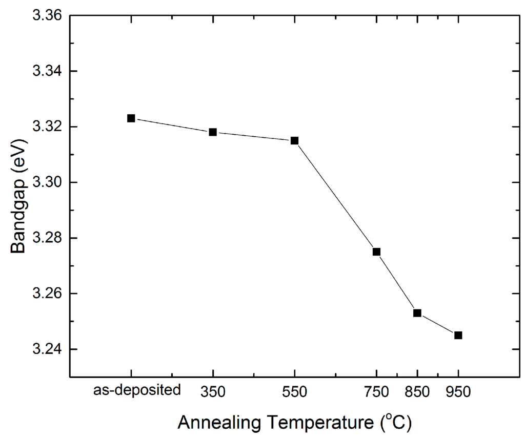 where α is the absorption coefficient, A is a constant, is the photon energy, is the optical band gap, and n = 1/2 for direct band gap material. Figure 6 shows the optical band gap of the ZnO:Zr films under various RTA treatments. The band gap of the as-deposited ZnO:Zr film is 3.31 eV, in agreement with the 3.30 eV reported by Lin et al. [24]. The band gap keeps almost constant up to 550 °C, then, it decreases to 3.245 eV after the 950 °C treatment. The band gap narrowing effect (EBGN) is believed to be a result of many body effects, and is expressed as [25]: