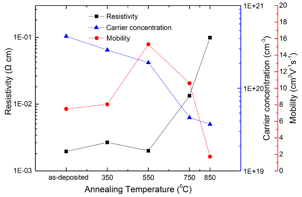 where µ is the resultant mobility, is the grain boundary scattering affected mobility, and is the ionized impurity scattering affected mobility. The initial increase of the Hall mobility indicates that the grain growth is dominant over other factors. When the annealing temperature increases above 550 °C, the Hall mobility decreases due to the increase of grain boundary scattering.