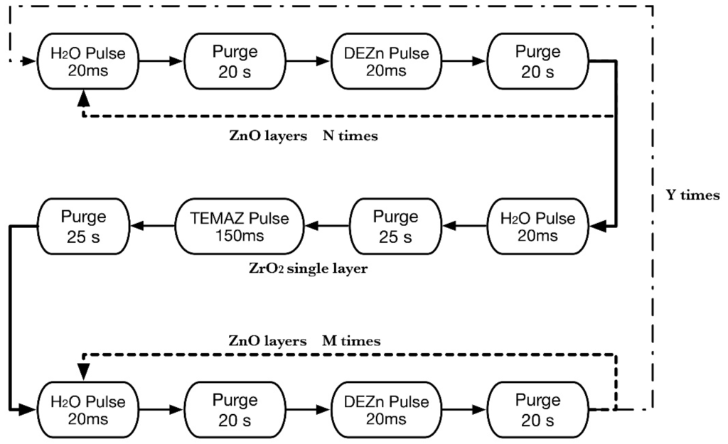 The substrates were firstly ultrasonically cleaned in isopropanol, acetone, alcohol, and deionized (DI) water for 10 min each. Then, each substrate was dried using high purity nitrogen. Diethyl-zinc (DEZn) and tetrakis-ethylmethylamino zirconium (TEMAZ) were used as the Zn and Zr sources, respectively, and DI water acted as an oxidizing agent. These precursors and an oxygen source were alternately introduced into the growth chamber with high purity nitrogen gas, which was used as the carrier gas and purging gas at a flow rate of 20 sccm. Typical ALD deposition sequences were DEZn (20 ms)/N2 purge (20 s)/H2O (20 ms)/N2 purge (20 s) and (TEMAZ (150 ms)/N2 purge (25 s)/H2O (20 ms)/N2 purge (25 s) for the growth of ZnO and ZrO2 films, respectively. The sandwich structural ZnO:Zr films were obtained by repeating N cycles of DEZn/H2O followed by one cycle of TEMAZ/H2O, then M cycles of DEZn/H2O to get access to the desired doping concentration, as shown in Figure 8. The temperature for depositing the ZnO:Zr films was maintained at 200 °C. The thicknesses of the films were measured by ellipsometer and were in the range of 94–95 nm. The prepared ZnO:Zr films were subjected to RTA (RTP-600XP, Modular Process Technology Corp., San Jose, CA, USA) treatment in the temperature range of 350–950 °C (with 200 °C as a step) in a high purity nitrogen atmosphere for 3 min. Meanwhile, RTA treatment at 850 °C also carried out as the resistivity increased rapidly during 750–950 °C.