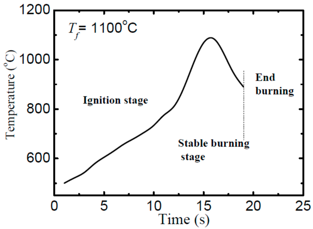 A representative temperature profile measured at the center of the sample (obtained from forging temperature of 1100 °C). A preheating process at 500 °C was carried out before burning test to accelerate the ignition.