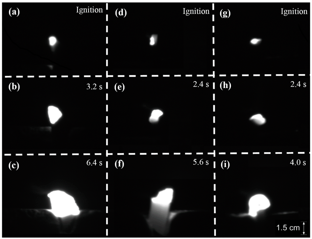 Captured images during burning for Ti14 alloy as obtained from: forging temperature of 1000 °C after ignition at the time of (a) 0.4; (b) 3.2; and (c) 6.4 s; forging temperature of 1050 °C after ignition at the time of (d) 0.4; (e) 2.4; and (f) 5.6 s; and forging temperature of 1100 °C after ignition at the time of (g) 0.4; (h) 2.4; and (i) 4.0 s. The oxygen partial pressure (Co) is 20% for all the three burning tests.