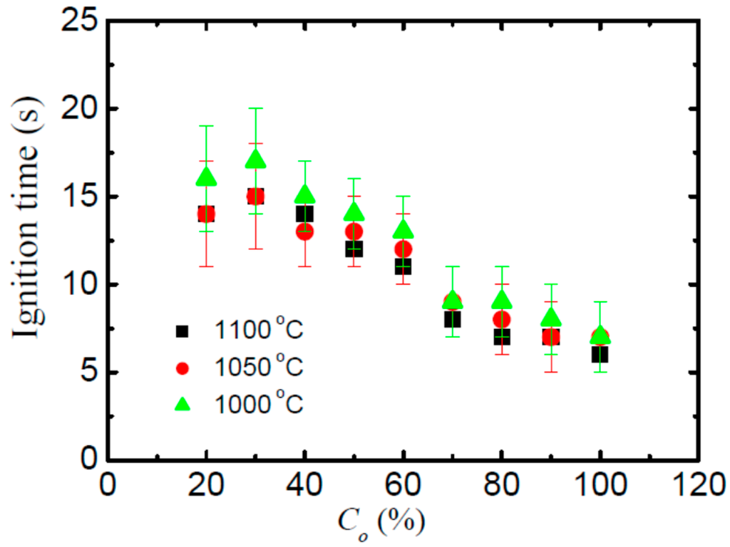 The ignition time as a function of the oxygen partial pressure (Co) for the Ti14 alloy as obtained from the forging temperature of 1000, 1050, and 1100 °C. The results are averaged over five burning tests. It is noticed that, to reduce the effect of heating times, a preheating process is provided to accelerate the ignition, which will influence the absolute ignition time, however, it will only influence the relative relationship between these values as focuses in this work.