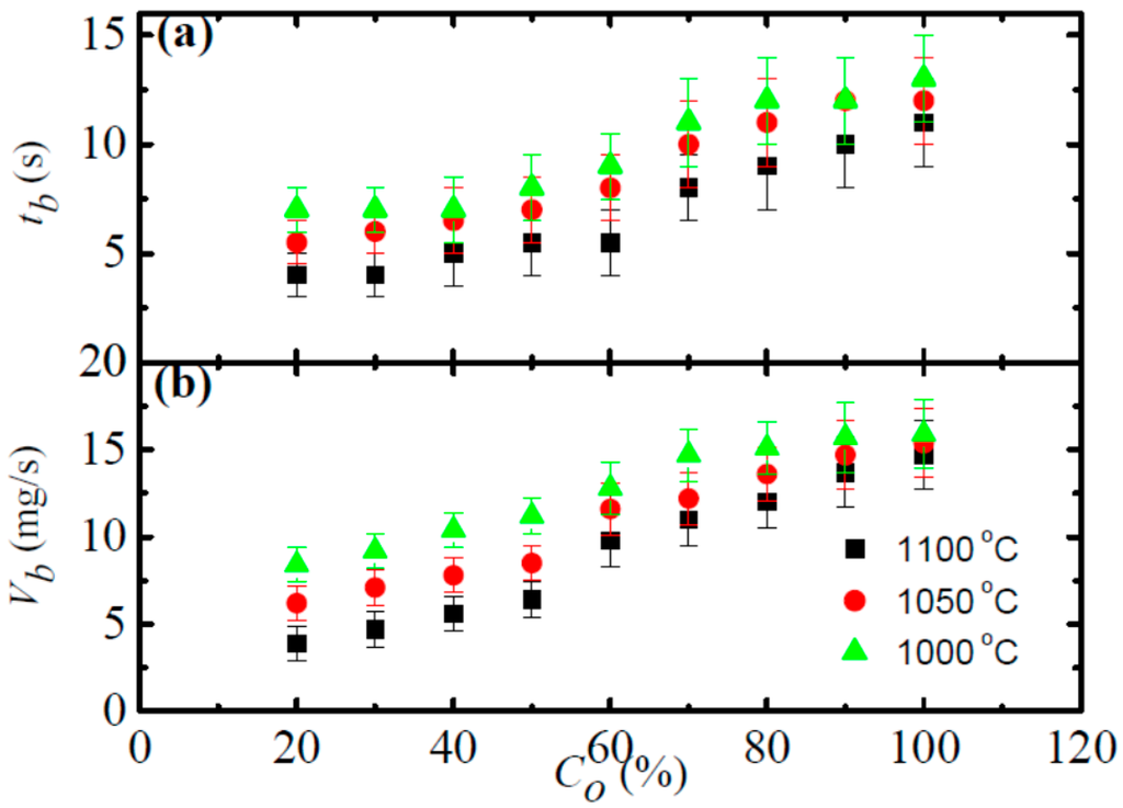 (a) The burning duration (tb) as a function of the oxygen partial pressure (Co); and (b) the corresponding burning velocity (vb) as a function of Co. The results are averaged over five burning tests.