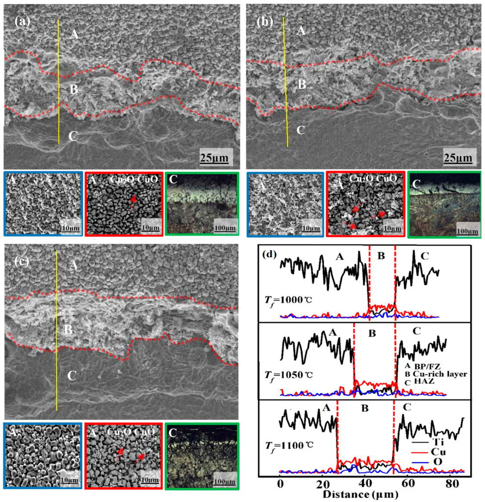 The SEM image of the burned Ti14 alloy as obtained from the forging temperature of: (a) 1000; (b) 1050; and (c) 1100 °C (Co = 20%). A, B, C represent the BPZ/FZ, Cu-rich layer, and HAZ, respectively. The first two insets for each figure are the SEM (blue frame) and SEM-BSE (red frame) surface morphologies of the burning products, respectively. The last inset for each figure is the OM image (green frame), which shows the microstructure of Ti2Cu precipitates in HAZ from the corresponding Ti14 sample after burning; and (d) EDS of the burned structures which clearly show the distribution of Cu.