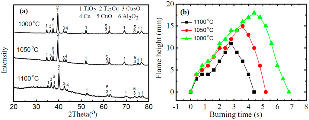 (a) XRD results of the burned products of forged Ti14 alloys (Co = 20%); and (b) comparisons of the flame height as a function of the burning time for the Ti14 alloy obtained from different forging temperatures (Co = 20%). The flame height was estimated from the recorded images every 0.4 s.
