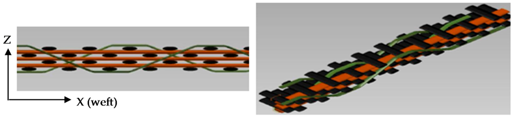 A schematic of 3D Angle Interlock Woven Composite (through thickness and planar view) (orange: weft; black: warp; green: binder yarn) (Binder yarn goes all the way through-the-thickness, z-axis, and then returns back).