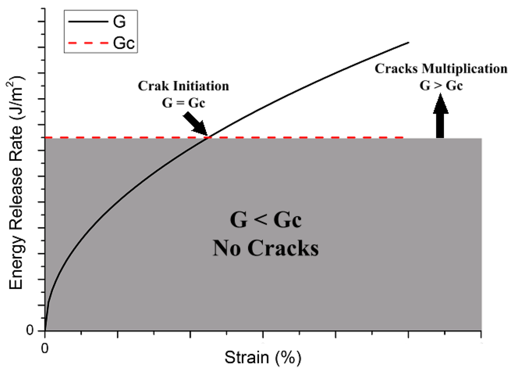 Figure 3 is a graph to illustrate the theory behind the finite fracture mechanics. The toughness of the material for a specific cracking mechanism is a material property which is constant while the energy release rate increases with increasing applied stress/strain. Once the energy release rate associated with a specific cracking mechanism exceeds the critical value, crack formation and damage evolution starts.