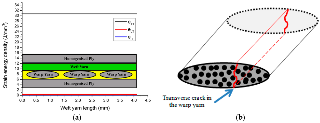 (a) Strain energy release rate along weft yarn (TT: Transverse component; LT: shear component; LL: axial component); (b) crack on a warp yarn cross section (Transverse crack).