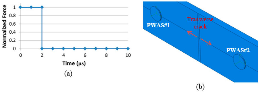 The maximum frequency of interest was chosen at around 600 KHz. For 600 KHz, a time interval of 0.1 µs and an element size about 0.5 mm in the composite plate are required to achieve an error on wave velocity below 5% [,]. A step excitation was used as shown in Figure 6a. To simulate the energy released by the transverse crack a two-point source force was applied between PWAS#1 and PWAS#2 at the surface of the specimen as illustrated in Figure 6b. A shear force, parallel to the crack could also be used, but would have no effect on the shape of the signals received by the PWAS. The end of the specimen is fixed to represent the real boundary conditions of the tensile test. However, the tensile load is not simulated.