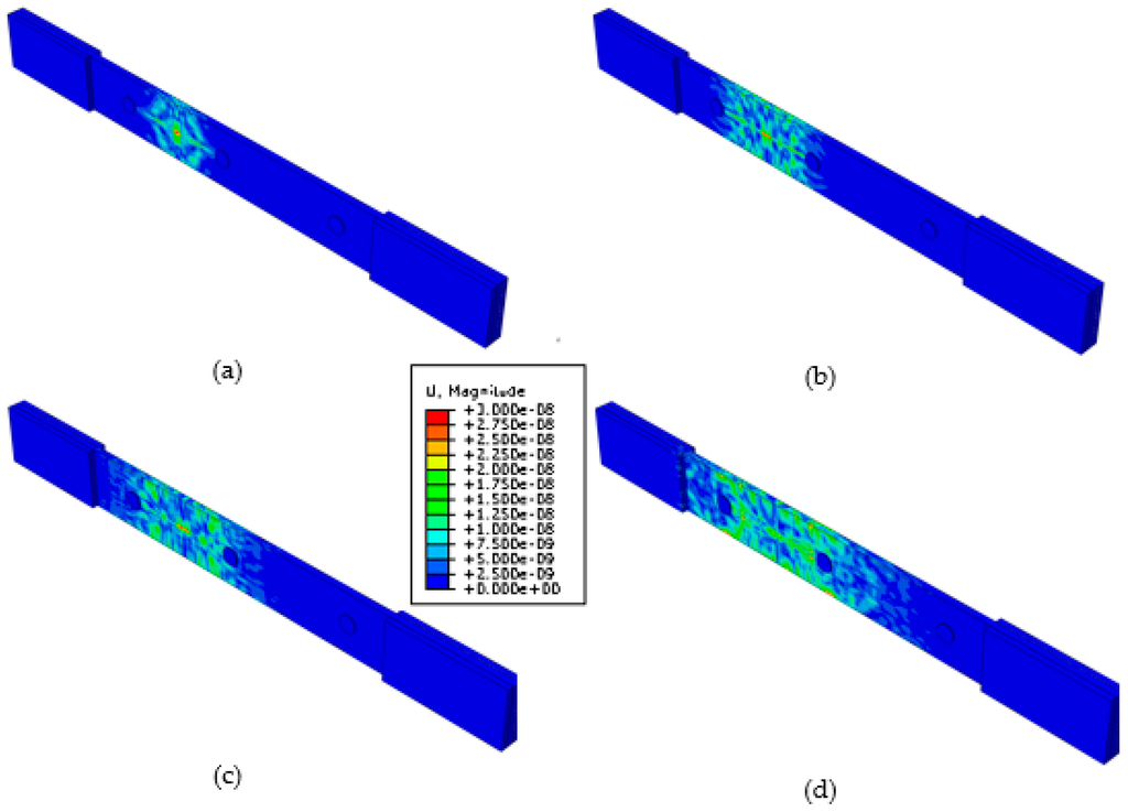 Snapshot of the MP-FEM simulation of guided waves generate by a pair of point forces simulating an acoustic emission by the transverse crack in a 3D angle interlock composite tensile specimen at (a) 10 μs; (b) 20 μs; (c) 30 μs; (d) 40 μs.