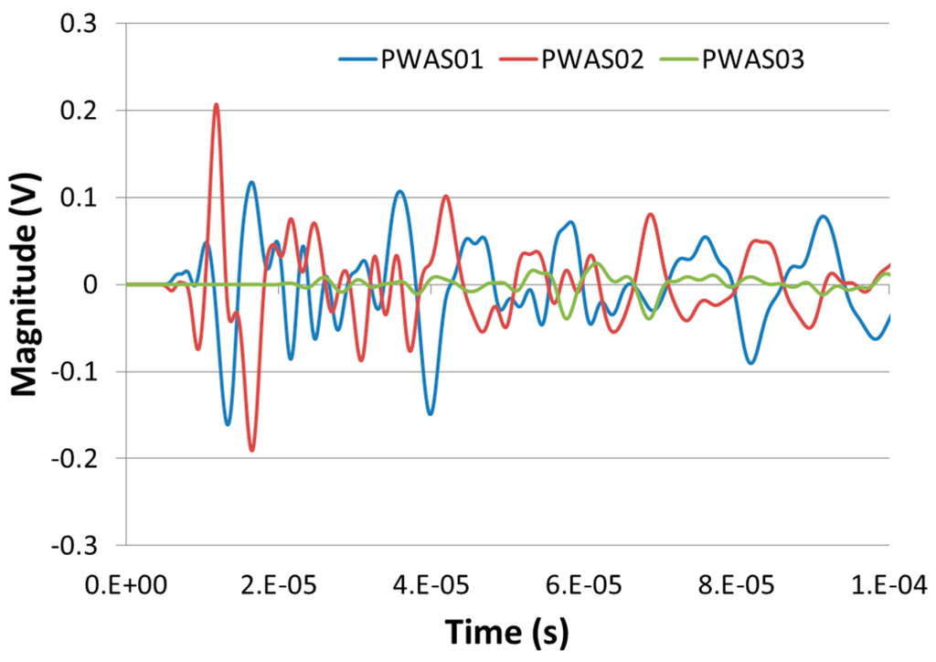 The simulated AE signal caused by the simulated transverse crack excitation as captured at PWAS#1, 2, and 3 is shown in Figure 8. The magnitude of the received signal from PWAS#3 (in green) decreased dramatically due the damping effect introduced in the model.