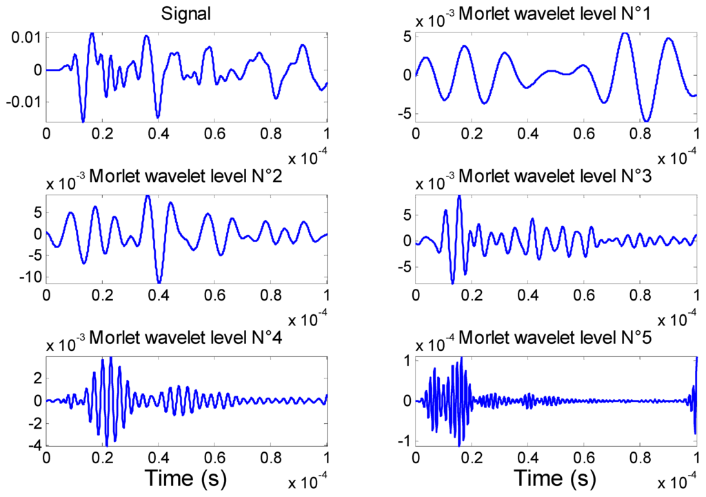 The main particularity of the DWT is that the result obtained with each daughter wavelet corresponds to the time behaviour of the signal in a frequency band corresponding to dilatation factor m. Each response is called the decomposition level. A number of different bases have been proposed to construct a family of wavelets. A good solution for analysis and decomposition can be obtained with the Morlet wavelet. The application of discrete wavelet analysis to the acquired AE signals resulted in its decomposition into six different levels. Each level represents a specific frequency range, and the frequency range increases with increasing wavelet level. The decomposed AE signals in level 1 to 5 are shown in Figure 9 for the PWAS#01.