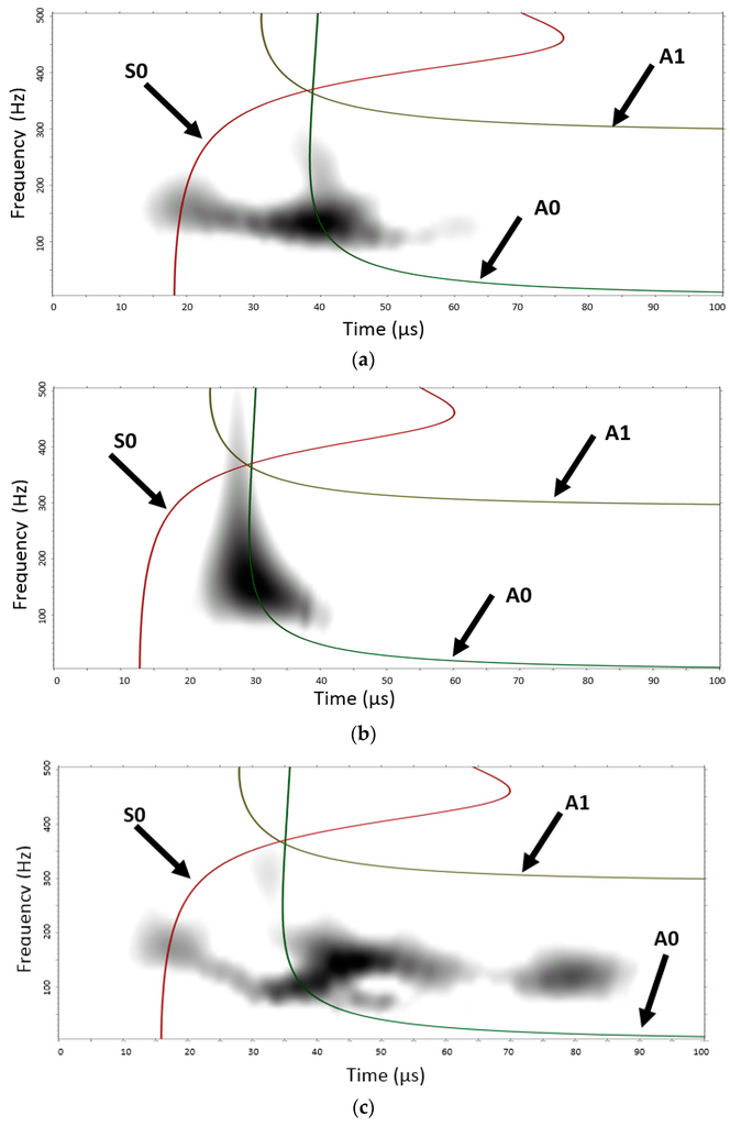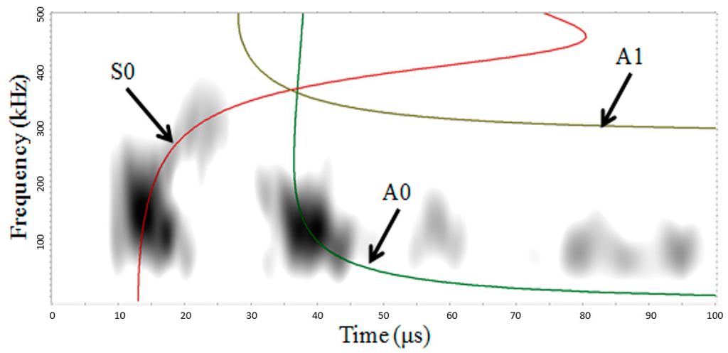 Figure 11 shows the continuous wavelet transform (CWT) magnitude as a function of frequency versus time. The CWT were calculated with AGU-Vallen Wavelet, a freeware software program []. This program has a Gabor function as the “mother” wavelet. Figure 11 shows the analytical dispersion curves with the three lowest modes (S0, A0, and A1) superimposed on the CWT plot. The colour scale is a linear scale with black representating the highest magnitude and white the lowest or zero-magnitude region. Clearly, Figure 11 shows the presence of AE signal energy in portions of mainly two modes, A0 and S0. The CWT shows how the signal energy is distributed as a function of frequency, time (or group velocity), and mode. Figure 11 shows that the simulated AE source has the greatest concentration (most black color) of energy is the fundamental anti-symmetric mode A0 in a frequency range of 50 to 250 kHz. Another large amplitude region of the CWT is the part of the fundamental symetric mode S0 in a frequency range 50 to 300 kHz. This demonstrates that the AE signal energy is not uniformly distributed between the modes; it is also not uniformly distributed as a function of frequency along each of the dominant modes.