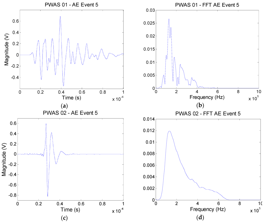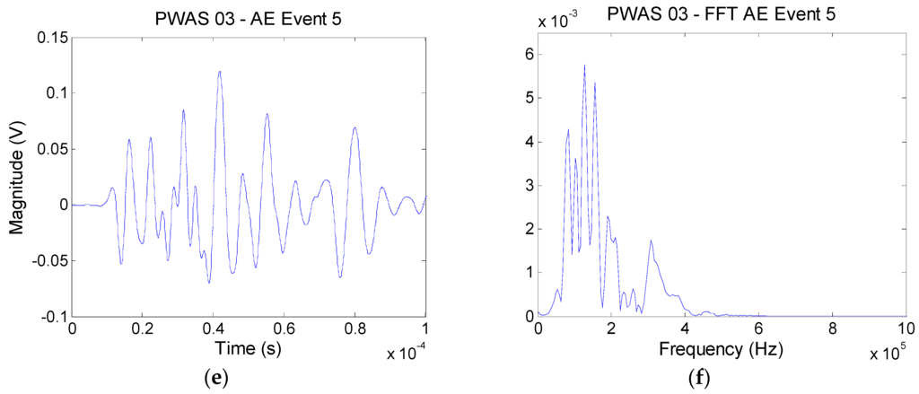 As mentioned in Section 3, at this applied tensile load only transverse cracking occurs in the studied specimen. Figure 12 shows typical AE waveforms received by the PWAS#1, #2, and #3, and the associated Fourier transform.