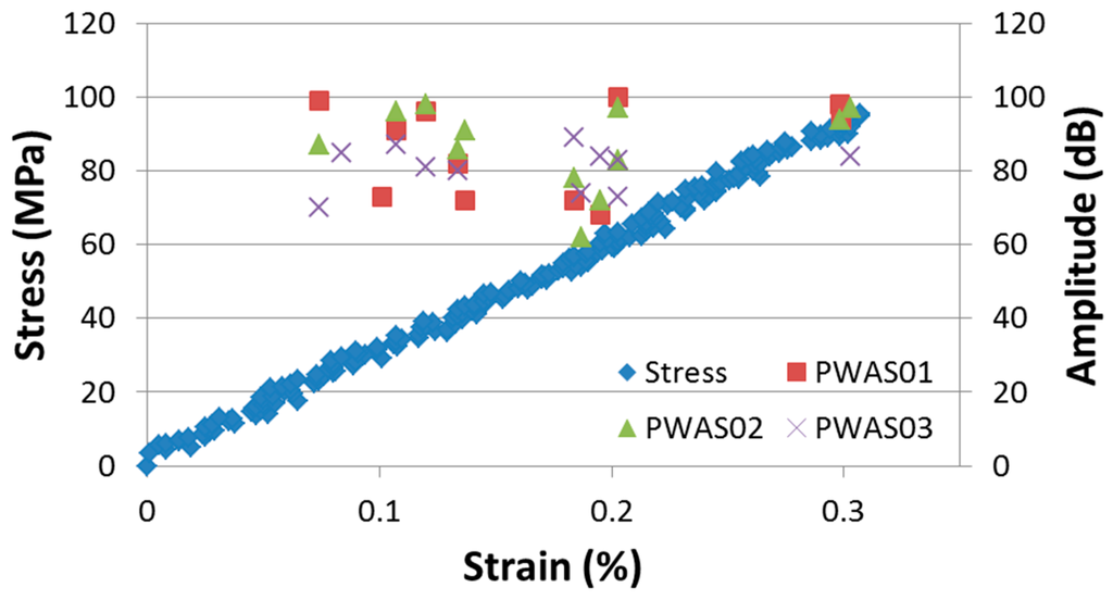 To develop only transverse cracks, the specimen was loaded up to 20% of its ultimate strength (σf). During loading, acoustic emission signals were recorded and the PWAS were able to pick up AE signal of good strength at a frequency range 100–700 kHz. The acquisition of the signals was performed using software ‘AEWin’ from Mistras with a sampling rate of 10 MHz and 20 dB pre-amplification. The AE PWAS sensors used in this study were provided by Steminc, further details in [].
