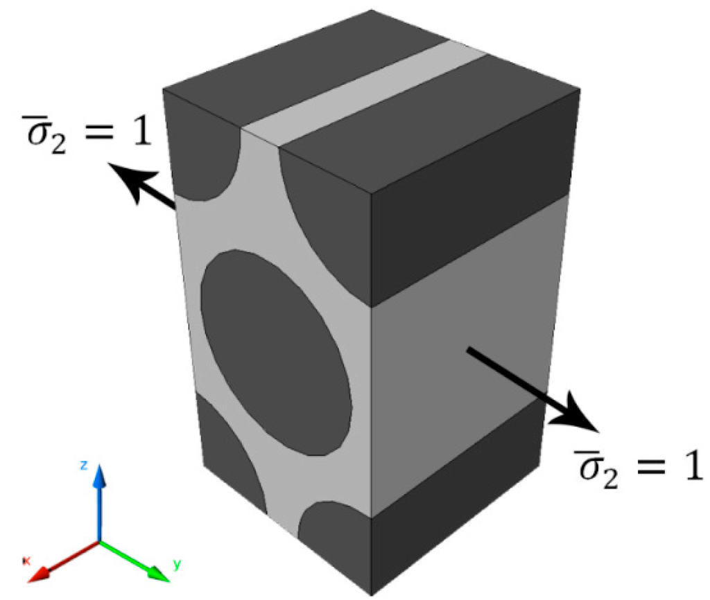 Further details regarding applying the boundary conditions and calculating the SAF can be found in [,]. After obtaining the stress amplification factors, a full description of the microscopic stress distribution within the unit cell can be determined as shown in Figure 16.