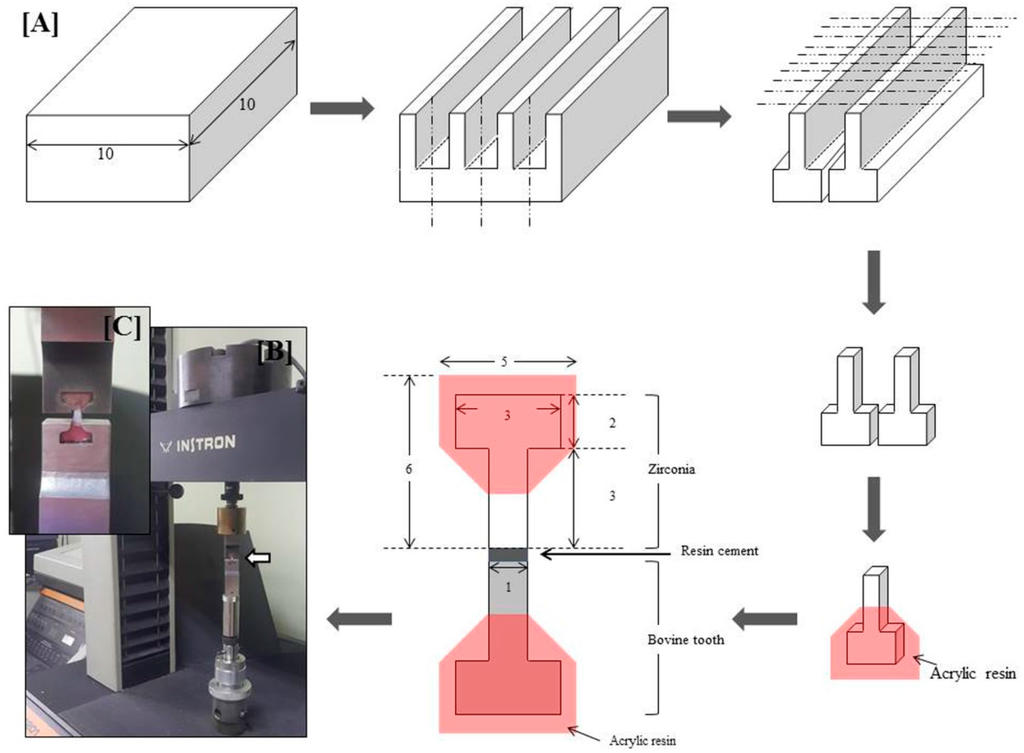 The experimental materials included a pre-sintered 3 mol % yttria-stabilized tetragonal zirconia polycrystal (3Y-TZP) ceramic block (Zirmon, Kuwotech, Gwangju, Korea) and 50 non-carious bovine incisors. The procedure involved cutting the 3Y-TZP and bovine teeth in distilled water using a high-speed diamond saw (Isomet 5000, Buehler, Lake Bluff, IL, USA) according to the procedure illustrated in Figure 1A. The ceramic (3Y-TZP) specimens were sintered according to manufacturer’s instructions (final bonding surface area = 1 mm2). Subsequently, both 3Y-TZP and enamel specimens were embedded separately in acrylic resin using mini-dumbbell molds and were fabricated to fit the tensile testing jig (Figure 1A). The bonding surface of 3Y-TZP and teeth specimens was polished with #400–1200 SiC sandpaper and then the specimens were washed for 5 min using distilled water with an ultrasonic cleaner, and were dried. For sandblasting, the bonding surface of 3Y-TZP was sandblasted with 110 µm alumina (Al2O3) particles from a distance of 10 mm for 10 s, at 0.4 MPa. The sandblasted specimens were heated at 900 °C for 10 min in order to stabilize the monoclinic phase to the tetragonal phase. Thereafter, the sandblasted specimens were either treated with selective infiltration etching (SIE), or an MDP-containing silane primer was applied, depending on the group. The details are displayed in Table 1.