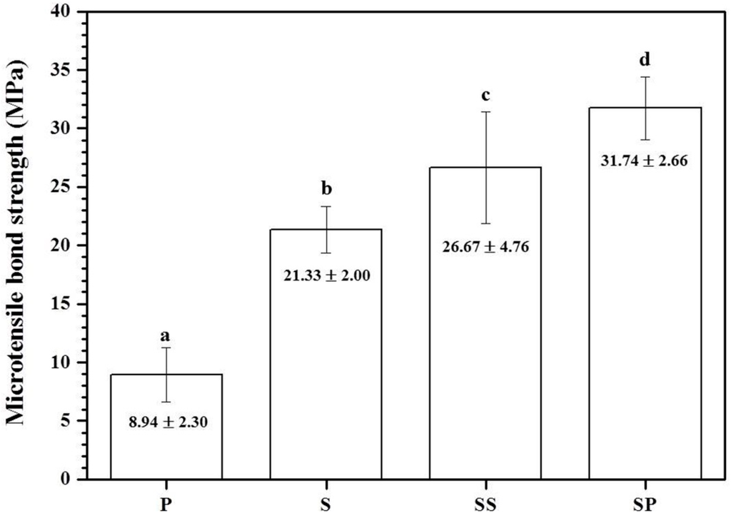 Tensile bond strength (TBS) of enamel bonded to 3Y-TZP after surface treatments. Bars indicate the standard deviation. P: Polishing; S: Sandblasting; SS: Sandblasting + SIE technique; SP: Sandblasting + MDP-containing silane primer. a–d: Groups shown with different letters were significantly different (p < 0.05).