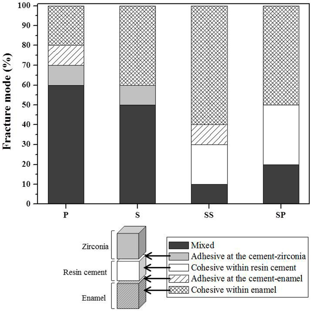 Percentages (%) of the fracture mode after tensile bond strength test of enamel bonded to 3Y-TZP. P: Polishing; S: Sandblasting; SS: Sandblasting + SIE technique; SP: Sandblasting + MDP-containing silane primer.