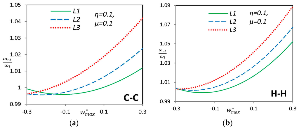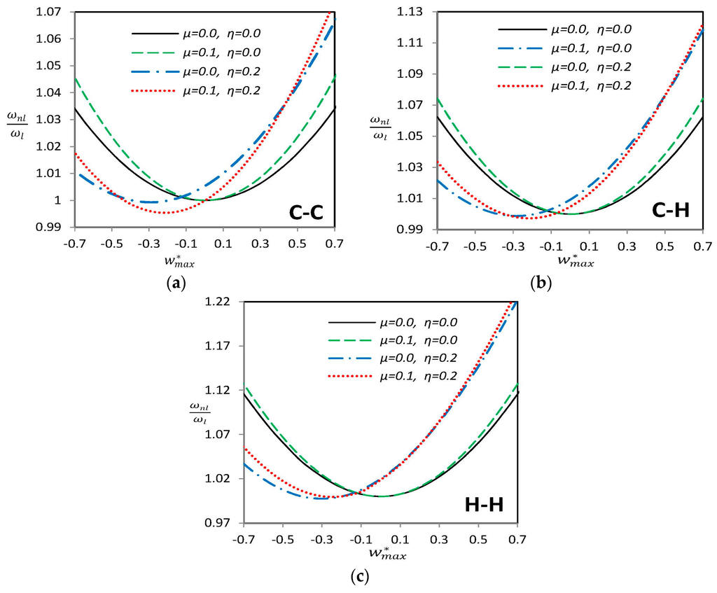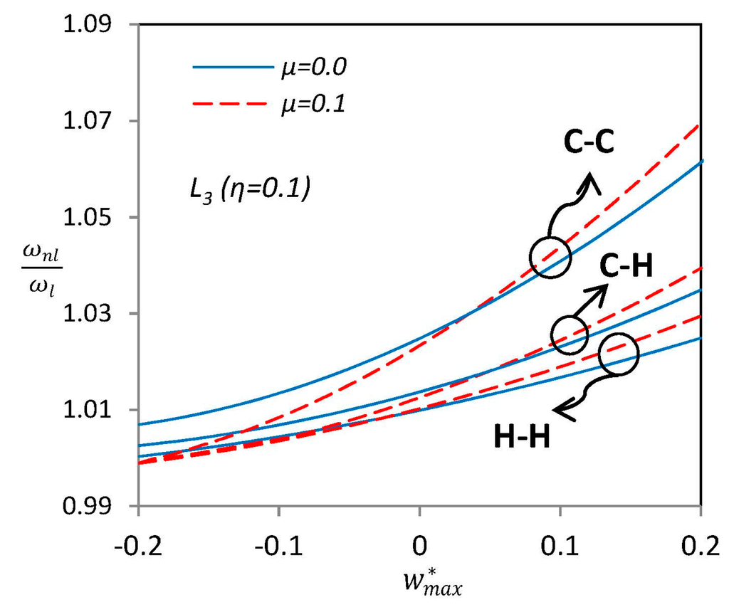 The iterative solution procedure to Equation (27) starts with ignoring the nonlinear part of the stiffness matrix and solving the corresponding linear eigenvalue problem. Thus it is possible to find eigenvalues and eigenvectors of each linear vibration mode. The vector of considered mode shape is appropriately scaled up in a way that the maximum component of lateral displacement is equal to a given dimensionless nonlinear vibration amplitude . After that, using the modified eigenvector, the nonlinear part of stiffness matrix is calculated and a new eigenvalue problem is formed to solve for new eigenvalues and eigenvectors. The corresponding eigenvector of considered mode shape is again scaled up and the procedure continues until the relative difference between the eigenvalue of the current iteration and previous one is lower than a predefined value [].