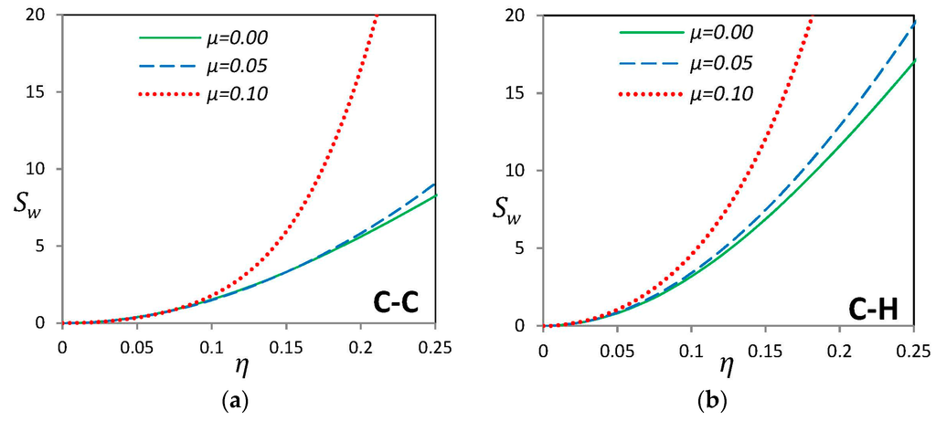To maintain the confidence in results obtained based on nonlocal constitutive equations, the dimensionless linear frequencies () of a straight (η = 0) SWCNT are listed in Table 2 for different values of the nonlocal parameter, and various boundary conditions. For possibility of comparison, the SWCNT properties are chosen as follows: radius r = 0.339 nm, tube thickness h = 0.066 nm, Young’s modulus E = 5.5 TPa, Poisson’s ratio υ = 0.19, and shear correction factor Ks = 0.563 []. As expected, increasing the nonlocal effect causes a decrease in dimensionless frequency. A noteworthy agreement is observed between the present results and those reported by Yang et al. []. Good agreement is observed between the results of current study and those by Wang et al. []. However, because they neglected the nonlocal terms in shearing force relation, the discrepancy between the results of two methods increases for higher values of nonlocal parameter.