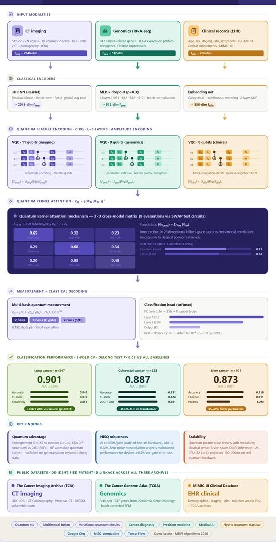 Diagnosis of cancer is one of the hardest problems faced in modern medicine and involves integrating different data sources such as medical images, genomic profiles and clinical records. Traditional machine learning methods have difficulty handling the high-dimensional and complex correlation properties of multimodal medical data. In view of this, we propose a new Quantum-Enhanced Multimodal Fusion Network (QEMFN) framework to break through traditional image–text matching based on quantum computing principles for CT imaging with genomic sequencing data and EHR information. Our approach utilizes variational quantum circuits for feature encoding, quantum kernel methods for crossmodal attention, and hybrid quantum–classical architectures for final classification. We realize the framework using Google Cirq quantum computing library and validate it on publicly available datasets including TCIA (The Cancer Imaging Archive), TCGA (The Cancer Genome Atlas), and MIMIC-III clinical database. The matched multimodal cohort comprises 847 lung cancer patients, 623 colorectal cancer patients, and 401 liver cancer patients with complete imaging, genomic, and clinical records, assembled via de-identified patient ID linkage across the three archives. The experiment takes steps toward the realization of quantum-enhanced diagnostic systems and offers a path for subsequent experimental confirmation. We theoretically analyze the potential quantum advantage, present detailed implementation details using Cirq, and describe a roadmap to clinical translation for quantum-enhanced diagnostic tools.