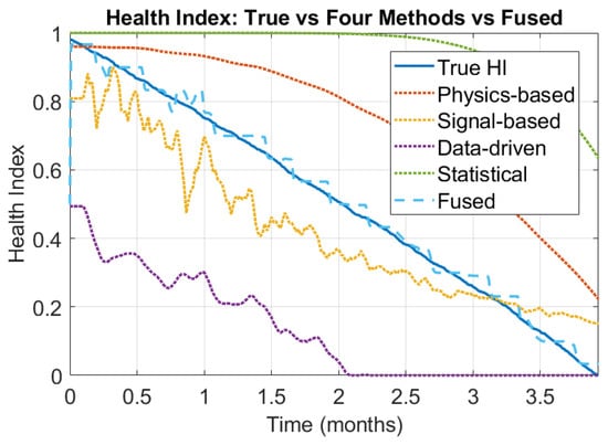 Fault prognosis is a key enabler of predictive maintenance in modern industrial systems, where heterogeneous sensing, modeling, and data analytics coexist under varying operating conditions. This paper proposes a reliability-aware health index fusion framework for hybrid fault prognosis that systematically integrates physics-based, signal-based,