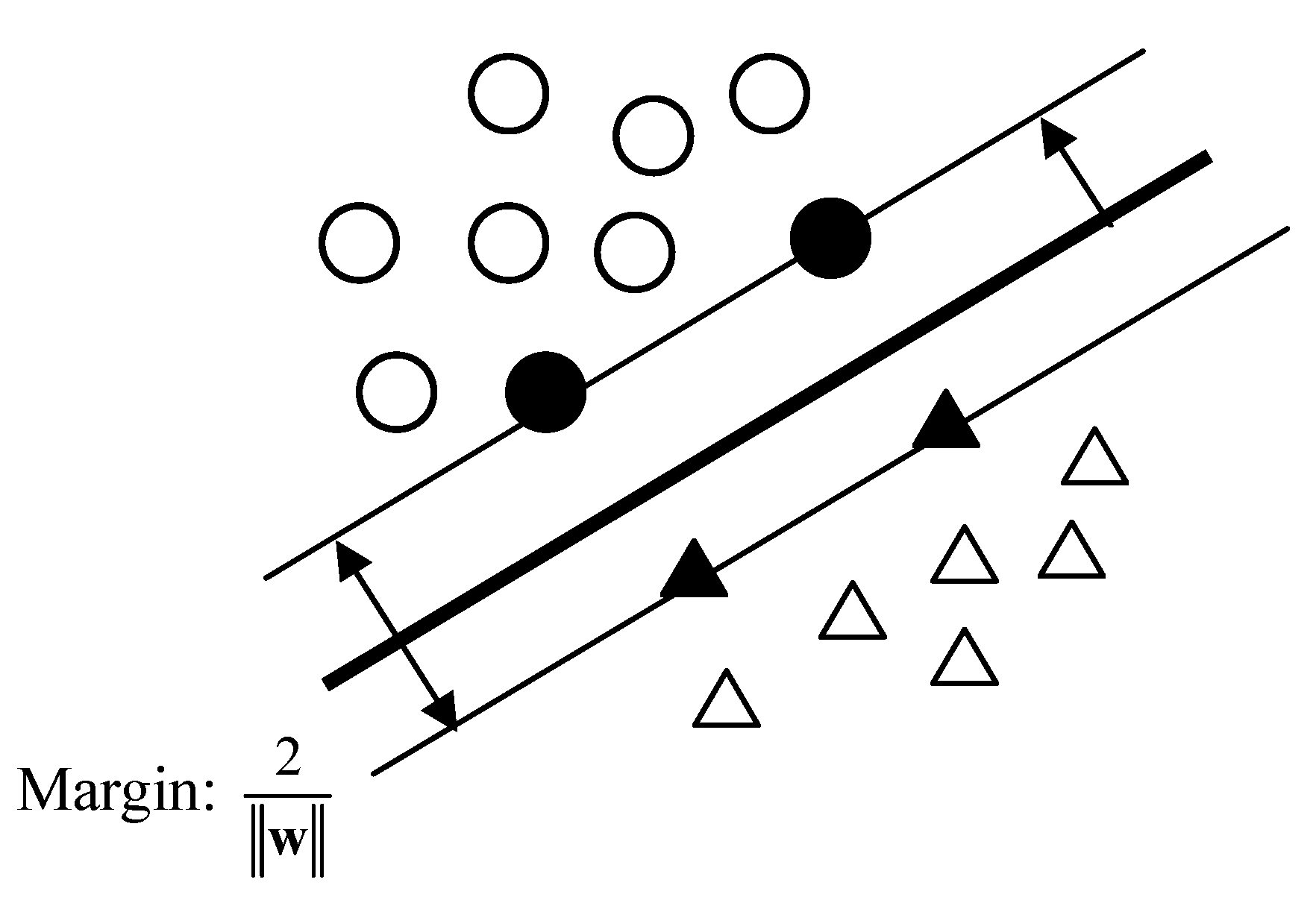 Figure 5 shows a schematic linear classification based on support vectors. The black circles and triangles are the support vectors of two classes, respectively. Basically, SVM is to find a discrimination function as shown in eq. (10), which is the same as LDA, but the calculation of the weight vector is only based on the support vectors.