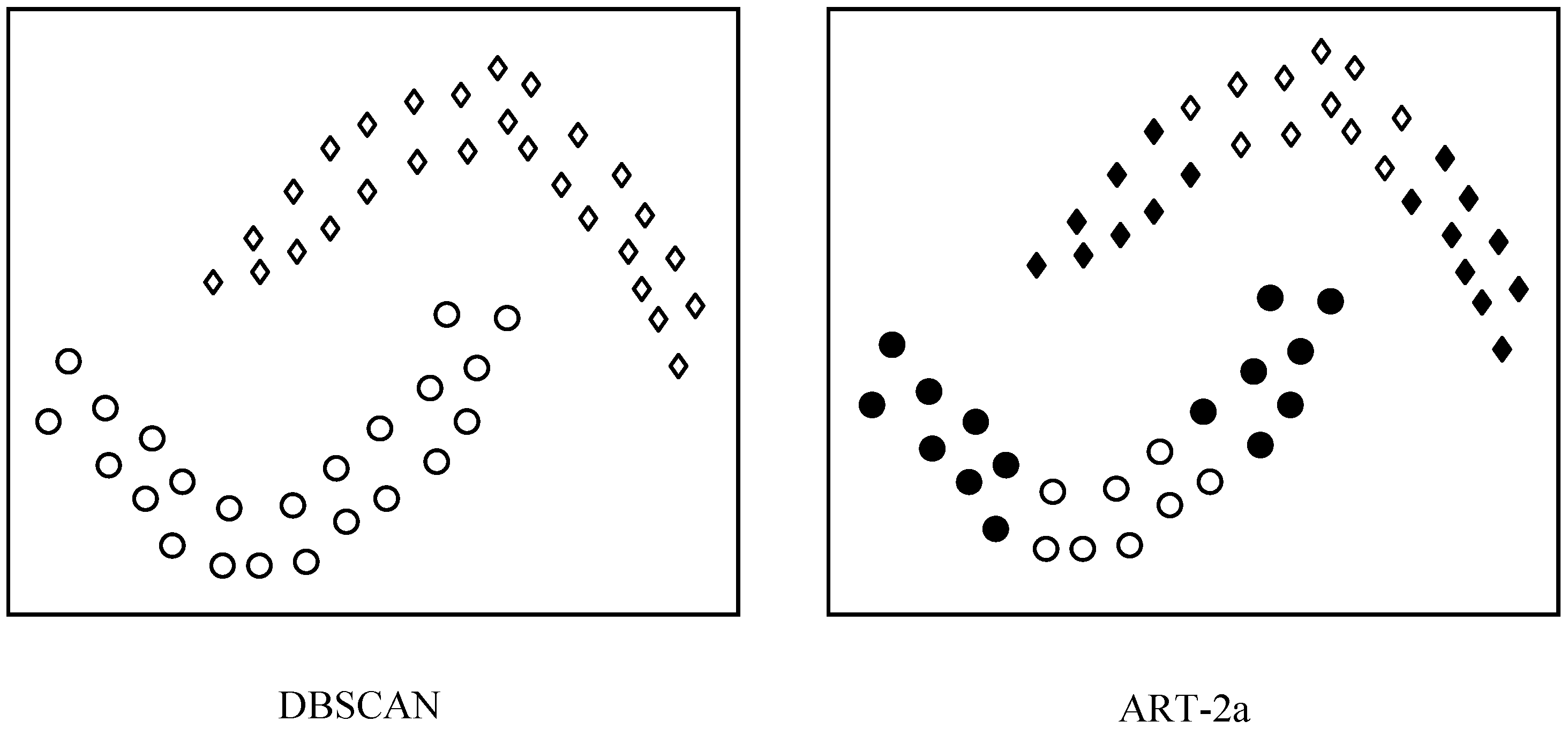 A schematic illustration of the difference between the clustering principles of DBSCAN and ART-2a.