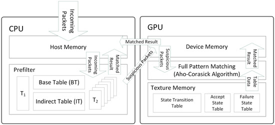 For this purpose, we focused on designing effective cooperation methods based on CPUs and GPUs. Our previous work HPMA [10] divides the processing tasks into two parts: rapid packet prefiltering and full pattern matching, as shown in Figure 1. First, the incoming packets are delivered to the CPU host memory, and then the CPU accessed the packets and started the prefiltering according to the lookup tables (T1, Base Table, Indirect Table and T2). The table size is sufficiently small so that it can reduce the memory access latency to decrease the pre-filtering time. In addition, a high filtration ratio is also achieved so that the number of packets can be decreased to reduce the data transfer latency. Next, the prefiltered packets considered “suspicious” are sent to the GPU for the full pattern matching process. We adopted the AC algorithm into the GPU platform, and the AC lookup tables were stored in the GPU texture memory for the algorithm use, since the access latency of texture memory is much lower than that of device memory. The matched result is copied back to the CPU host memory after the full pattern matching is completed. By using the pre-filtering method in HPMA, the CPU can perform rapid pre-filtering and reach a high filtration ratio so that the GPU latency can be decreased and make the processing more efficient. HPMA outperformed the CPU-only and GPU-only pattern matching algorithms by 3.4 and 2.7 times, respectively, with input traffic of 1460-byte random payloads, indicating that the collaboration between the CPU and GPU can improve overall processing speed.