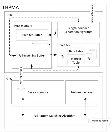 Figure 2 illustrates the architecture of LHPMA. As for the cooperation, the CPU is responsible for pre-filtering the packets, and the GPU is responsible for inspecting the packets by full pattern matching. Here, an additional process, the “length-bounded separation algorithm” (LBSA), is executed by the CPU. Different from the previous work, the incoming packets pass the LBSA before they are sent to the prefilter buffer in the CPU host memory, in which those packets to be processed by the prefilter are stored. The task of LBSA is checking the payload lengths and determining the allocation of those packets. The LBSA is described in the next subsection. After the LBSA process, some packets are stored in the prefilter buffer and thus delivered to the CPU prefiltering (dashed-line arrow); on the other hand, the other packets are directly sent to the full-matching buffer in the CPU host memory (dotted-line arrow), which is used for storing the packets to be processed by the GPU for full pattern matching. In addition, when the prefilter buffer becomes full, the prefiltering is executed; prefiltered packets are also sent to the full-matching buffer (dashed arrow).